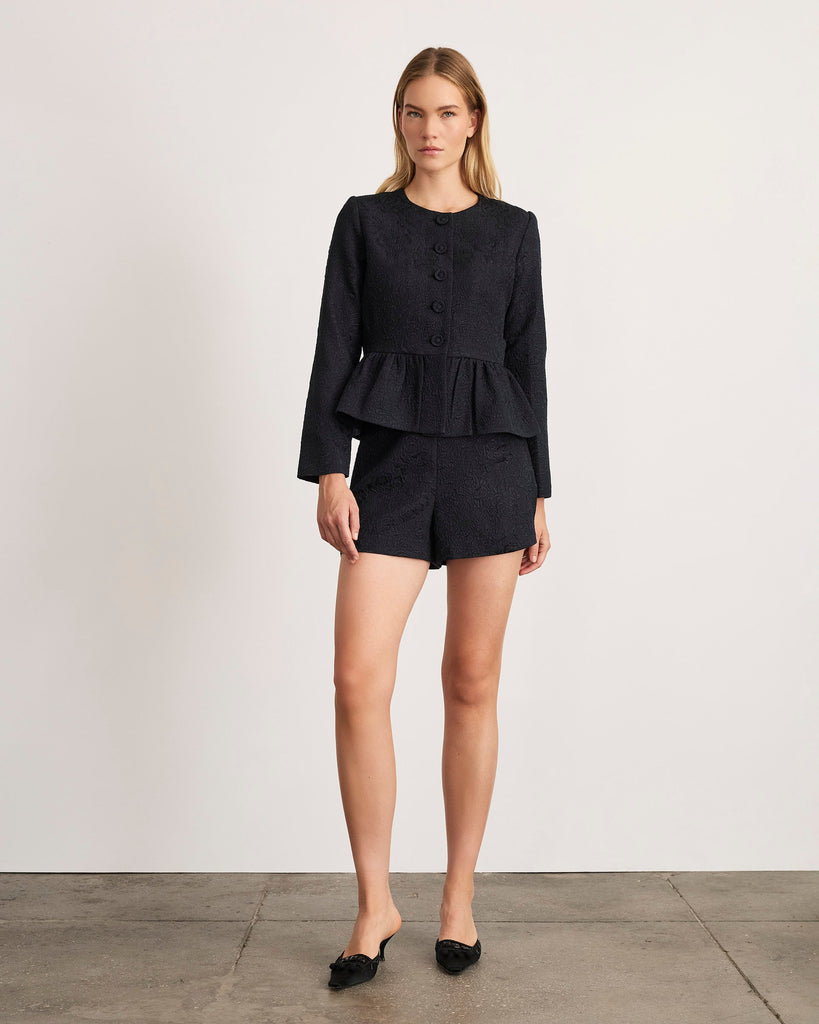 The Karleigh Jacket in Black offers a modern take on timeless tailoring with its sculptural texture and feminine shape. Crafted from luxe cloque jacquard, this cropped silhouette features a crew neckline, button-front closure, and a soft peplum hem that adds dimension and charm. Effortlessly refined, Karleigh brings everyday polish to holiday dressing.