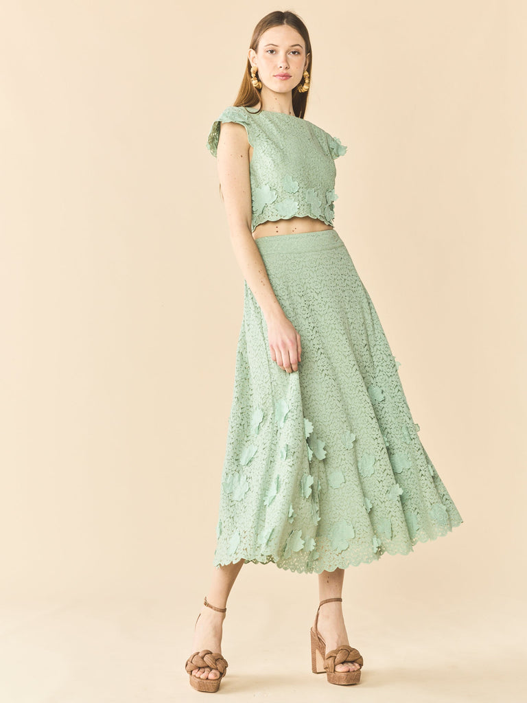 Tomboy looks, girly-girl styles, and an always fashionable approach define EDDY’s aesthetic. With a focus on bold and feminine silhouettes, EDDY dresses and tops pair elevated California bohemian with global inspiration; these are clothes designed to make you feel good inside and out. Meet the Kelly Skirt in Minty Green. A romantic midi skirt crafted in minty lace and adorned with tonal 3D floral appliqué. The fit is soft and floaty with a gentle flare, designed to sit high on the waist and move with ease. Finished with a scalloped hem for an extra feminine touch. Pair with the matching top or dress it down with a tee—either way, she’s a breath of fresh air.