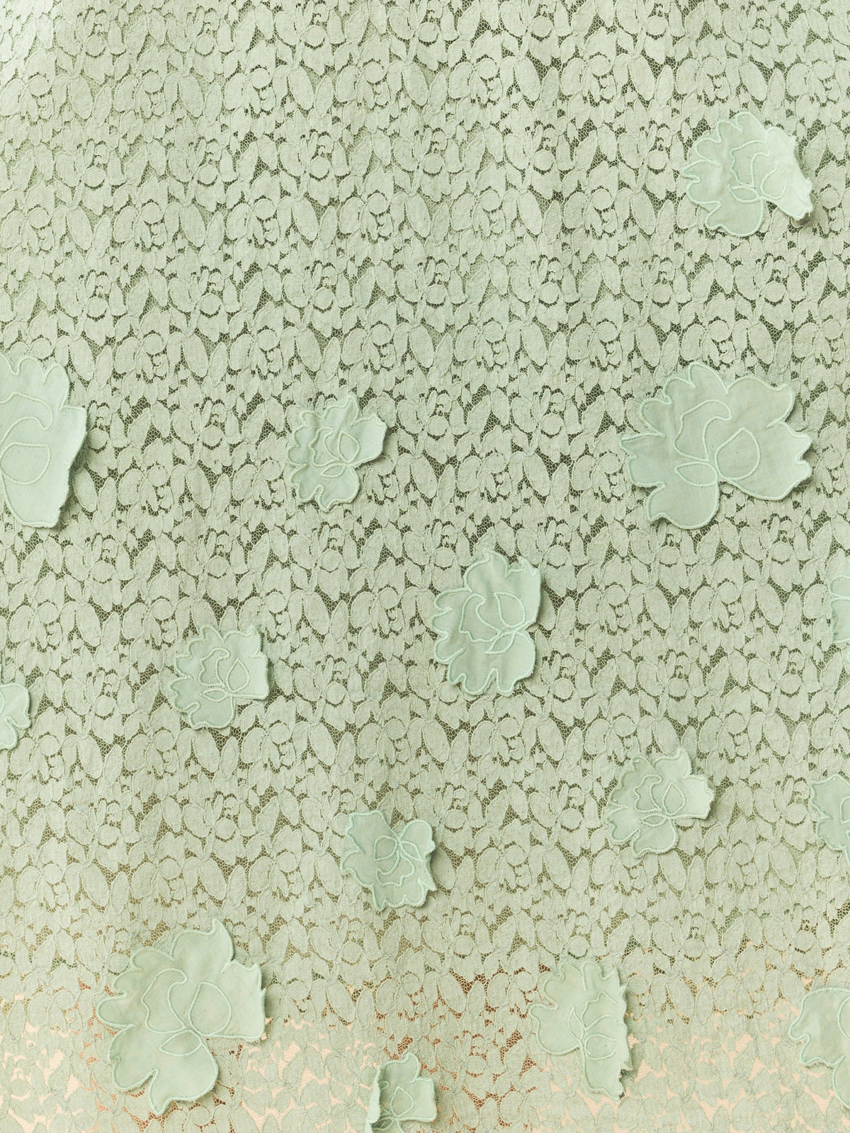 95% cotton, 5% linen. Tonal 3D floral appliqué details. High waisted. Soft A-line silhouette. Scalloped hem for a romantic finish. Invisible side zipper with hook & eye closure. Back waistband with added elastic for extra comfort. Mint floral lace. Made in India.