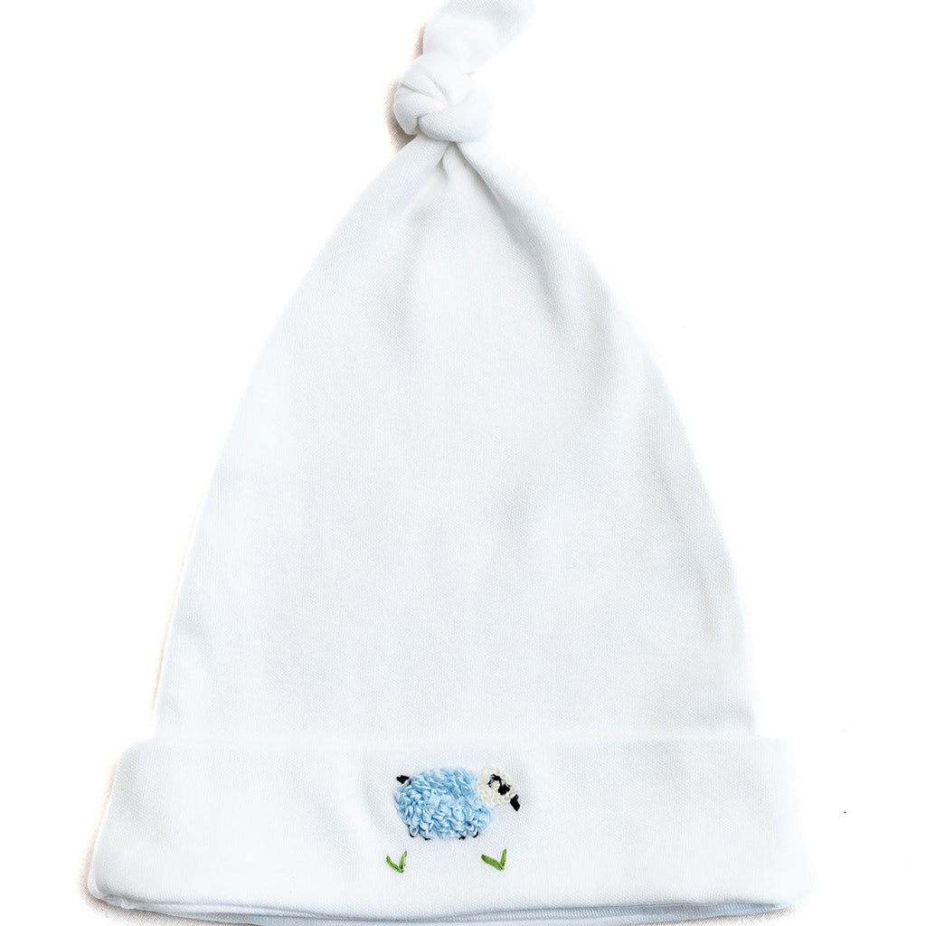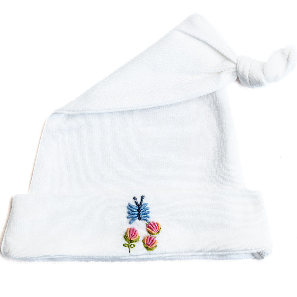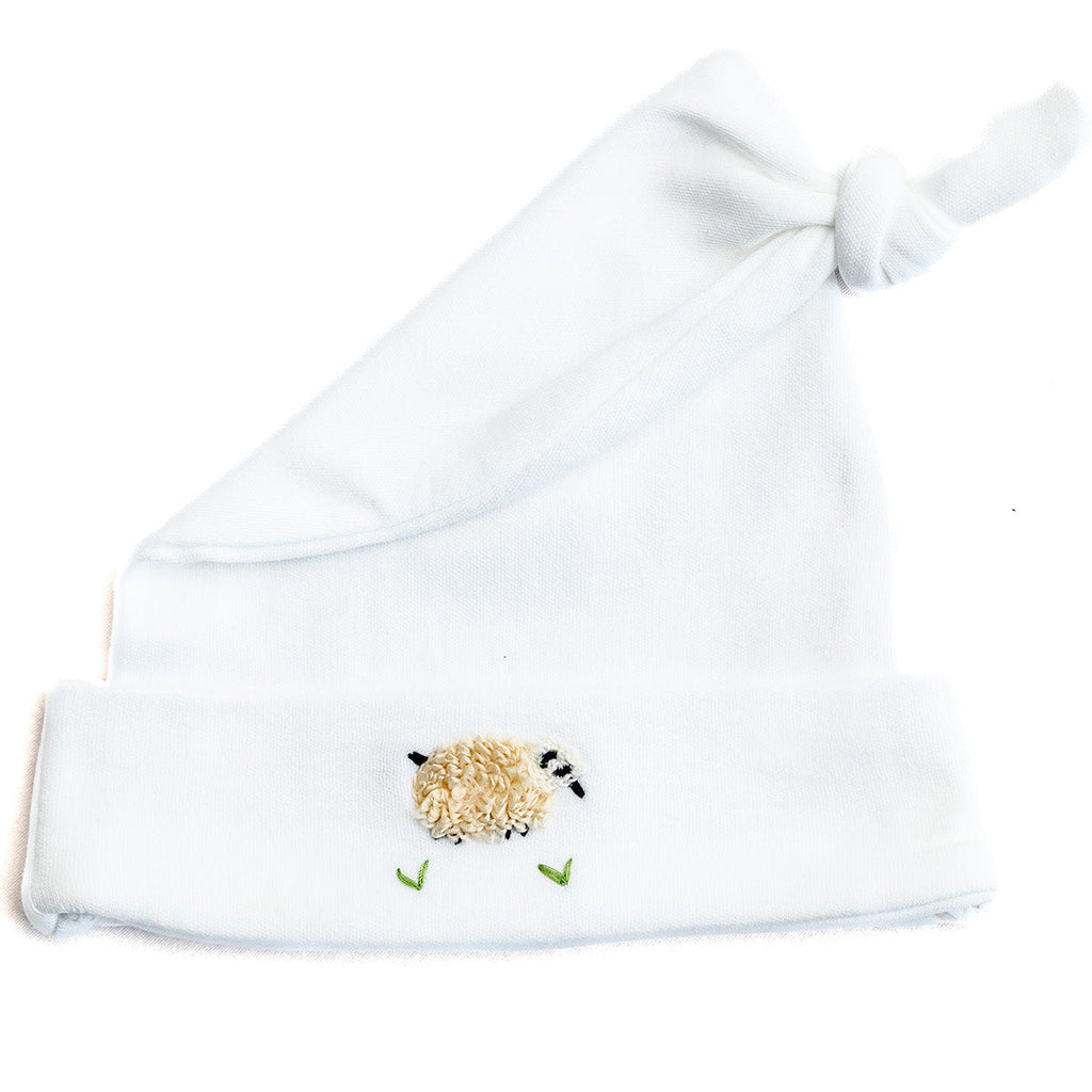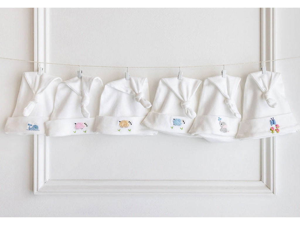 The Knotted Baby Hat in Combed Cotton is a soft, cozy essential for newborns and infants. Crafted from super-soft white combed cotton, it features a sweet knotted top and your choice of delicate embroidery—from bouclé motifs like Sheep, Whale, and Elephant to hand-embroidered classics like Rosebuds and Butterfly. A thoughtful gift for any little one.