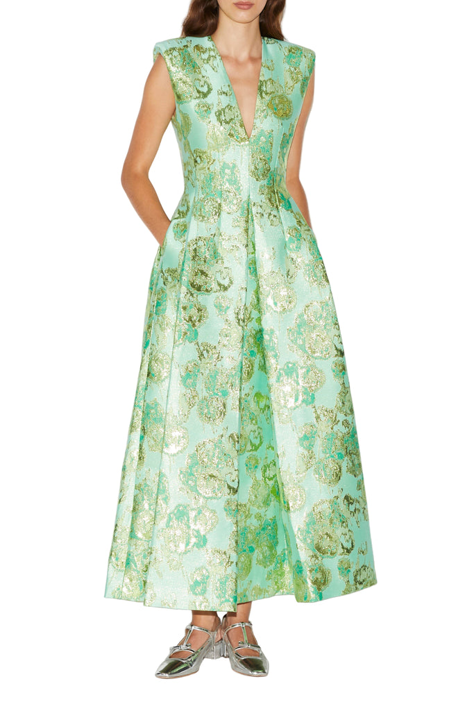 The London-based luxury brand, Huishan Zhang, was launched in 2011. As a Chinese-born designer, Huishan combines his heritage with Western influences to create a sophisticated, signature style. The Kyle Dress in Jade Jacquard captures this aesthetic beautifully, blending sculptural tailoring with romantic detailing. Crafted in a luminous jade green floral brocade with golden accents, the silhouette features structured shoulders, a plunging V-neckline, and a full A-line skirt with soft pleats that create graceful movement—an elegant choice for elevated occasions.