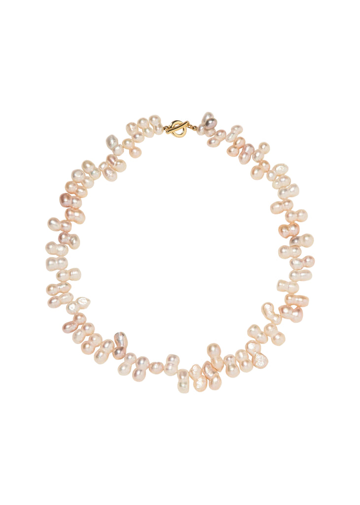 Freshwater pearls. 18K gold-plated magnetic clasp. Each pearl varies slightly in shape and size, making every necklace one-of-a-kind. Handmade in New York City.