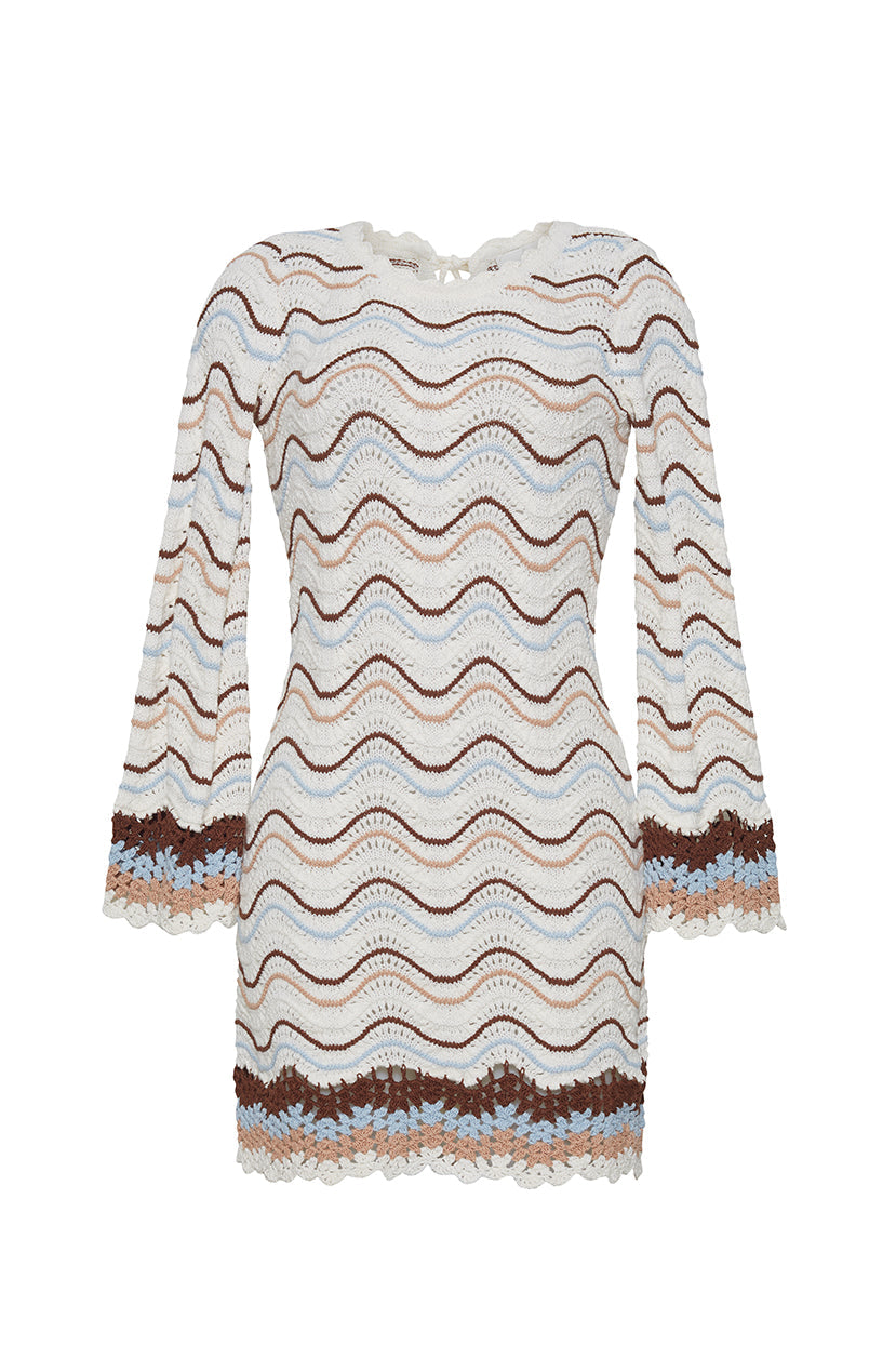 Reversible boat neck mini dress with bracelet sleeves. Tie-back keyhole detail with tassels. Hand crochet trims and multicolored novelty crochet stitch. Easy, relaxed fit. Unlined.