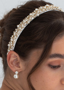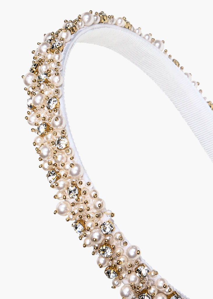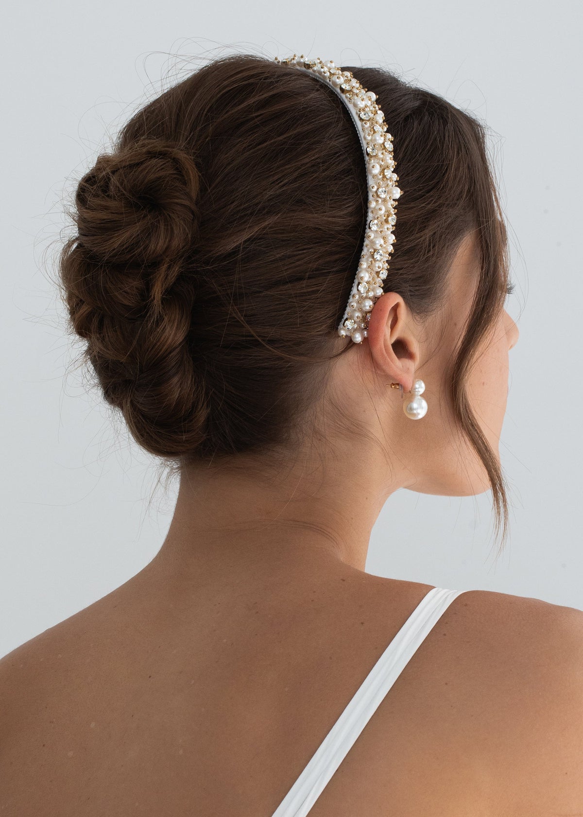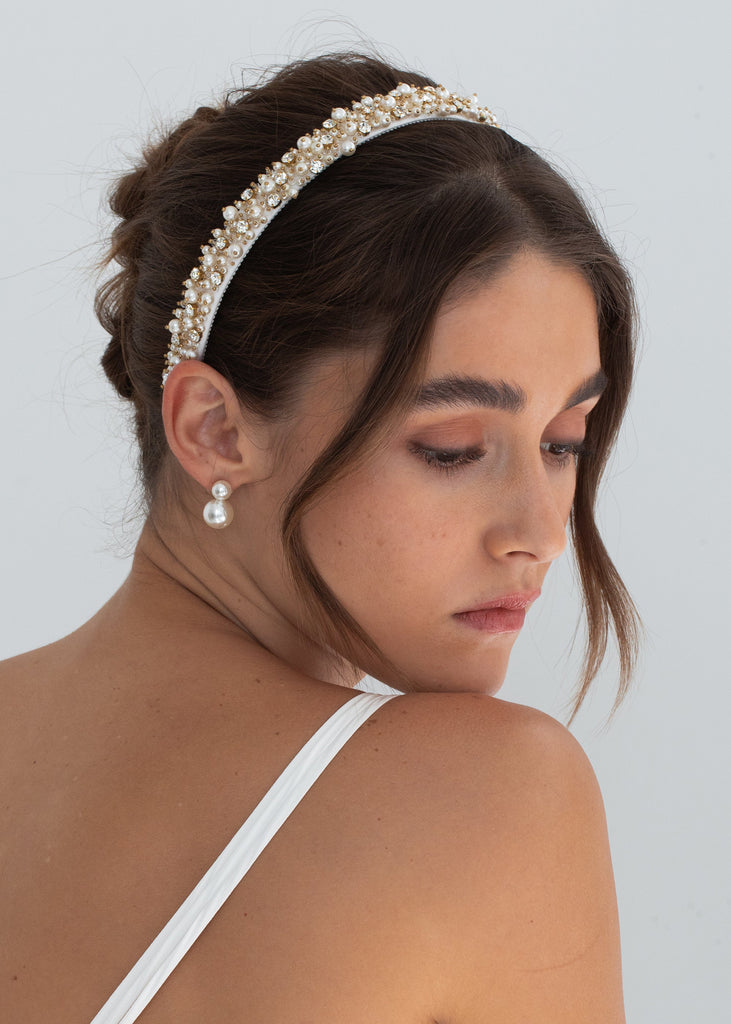 “Everything has a story to tell,” says Jennifer Behr, the founder of her namesake luxury hair accessory brand that has blossomed into one of New York City’s foremost ateliers for jewelry, as well as bridal. In every crystal, pearl, and ribbon, you’ll find the utmost quality and a sense of romance, as each piece reveals a modern interpretation of centuries-old regalia. The Landyn Headband is the ultimate marriage of organic forms and modern glamour, featuring an array of hand-embellished pearls, gems, and beads. Drawing inspiration from the irregularities of seashells, barnacles, and other natural wonders, the embellishment is organically dispersed, as though it were scattered there by waves. The luxe silk base is the ideal foundation to make these adornments pop, and the grosgrain-lined interior ensures it stays in place all day and night.