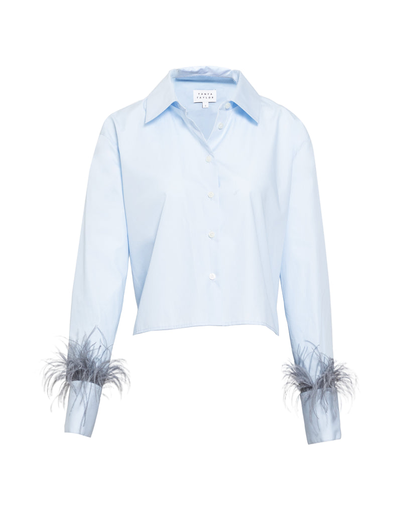 The Largaux Feather Top in Oxford reimagines the classic button-up with playful texture and modern tailoring. Crafted from crisp cotton shirting, this feminine silhouette features a collared neckline, button-front closure, and internal sleeve loops for effortless scrunching. Finished with feather-trimmed cuffs and a slightly cropped length, Largaux brings a statement touch to everyday polish.