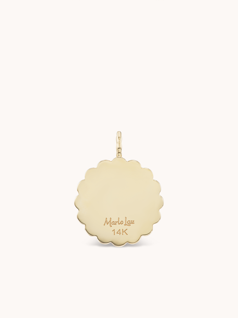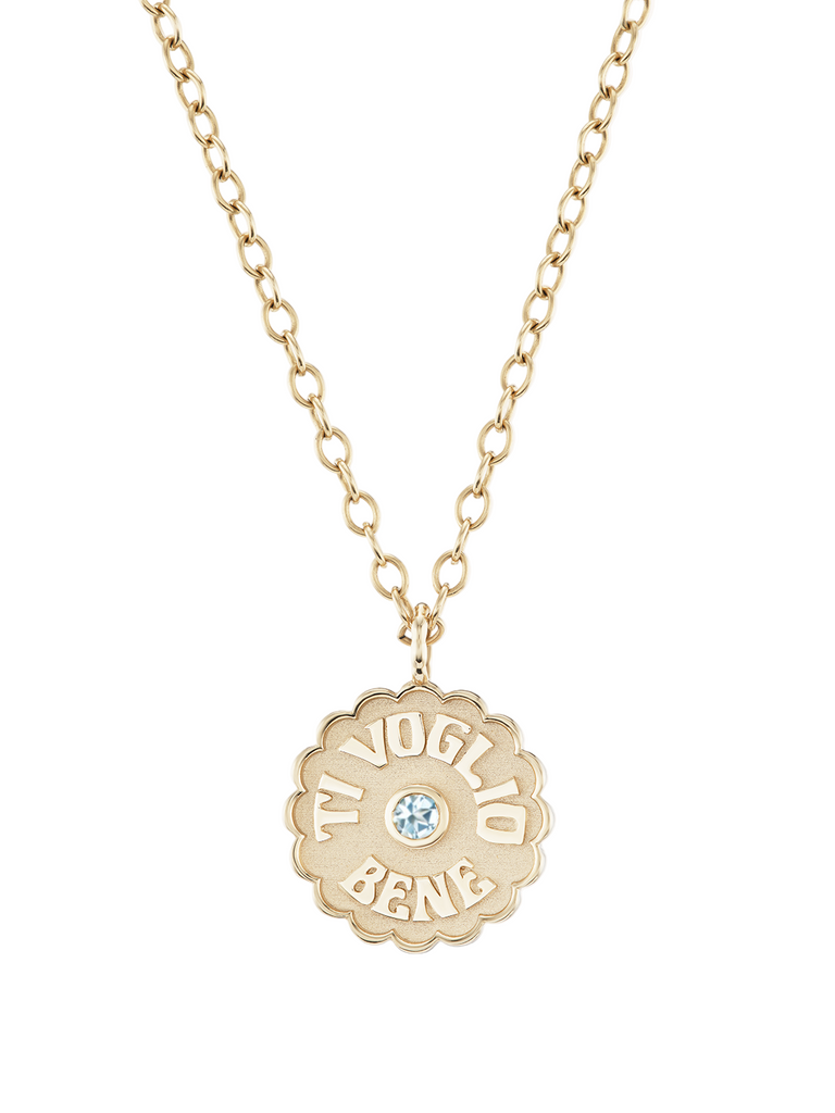 Founded by designer Jesse Marlo Lazowski, Marlo Laz creates fine jewelry steeped in symbolism and sentiment, designed to be both personal and poetic. From the *Moonstruck* Collection, the Large Raised Gold *Ti Voglio Bene* Aqua Necklace—Italian for “I love you”—expresses an all-encompassing and selfless love that transcends words. Translating to “I want you to be well,” this timeless token of affection is a tribute to unconditional care and connection. Formed from continuous crescent moons, the raised gold inscription encircles a luminous aquamarine, symbolizing serenity and protection.