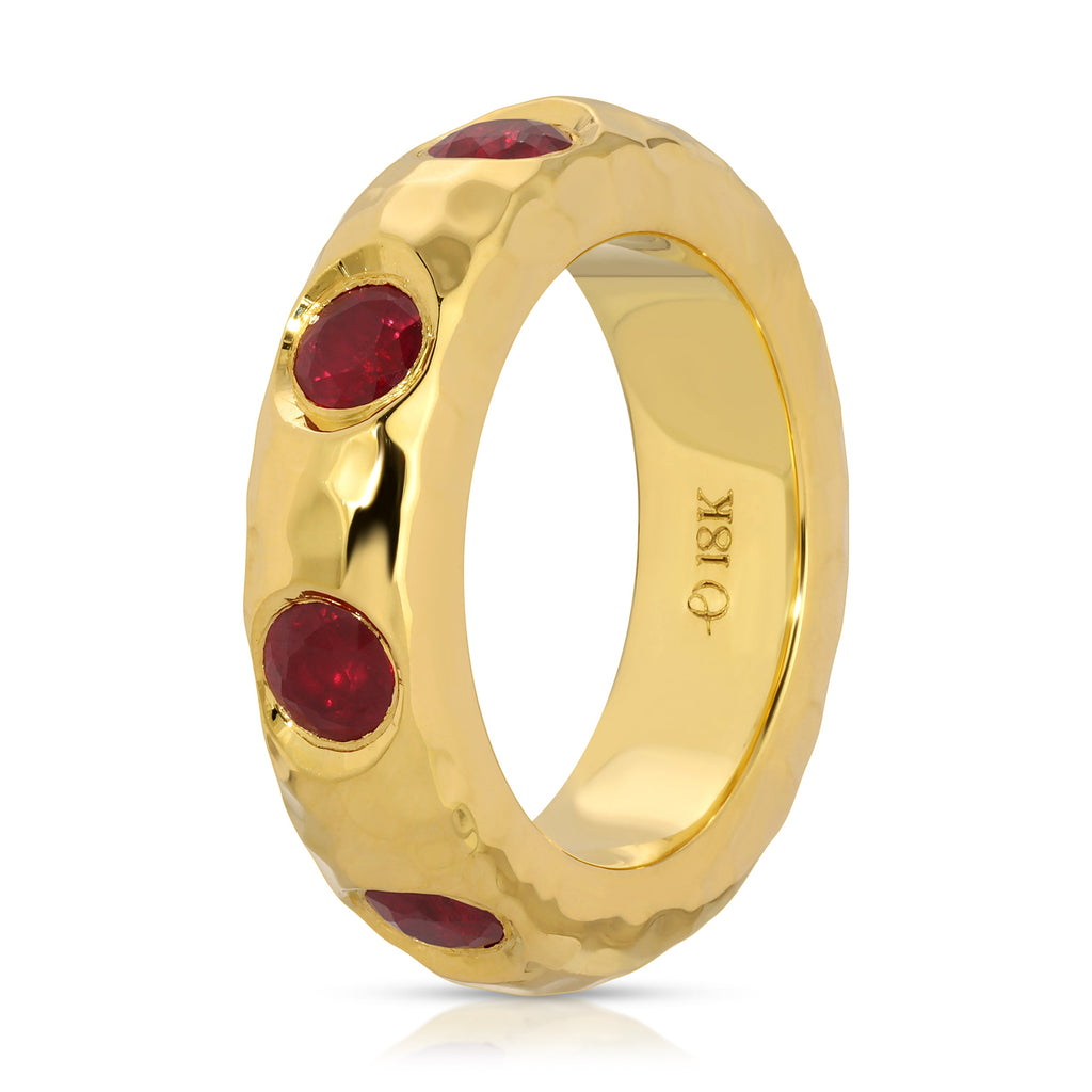 18K yellow gold. Rubies. Wide band design. Made in the USA.