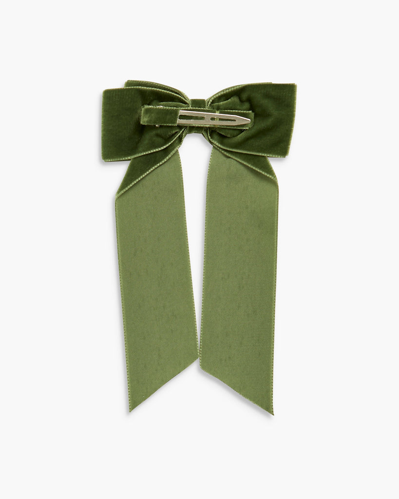 The Large Velvet Long Tail Bow in Moss adds a timeless and elegant touch to any outfit. Handcrafted from rich velvet ribbon, this beautifully tied long-tail bow is secured on a velvet-covered alligator clip for a comfortable, secure fit. A refined accessory that elevates everyday looks and festive ensembles alike—ideal as a thoughtful gift for any occasion.