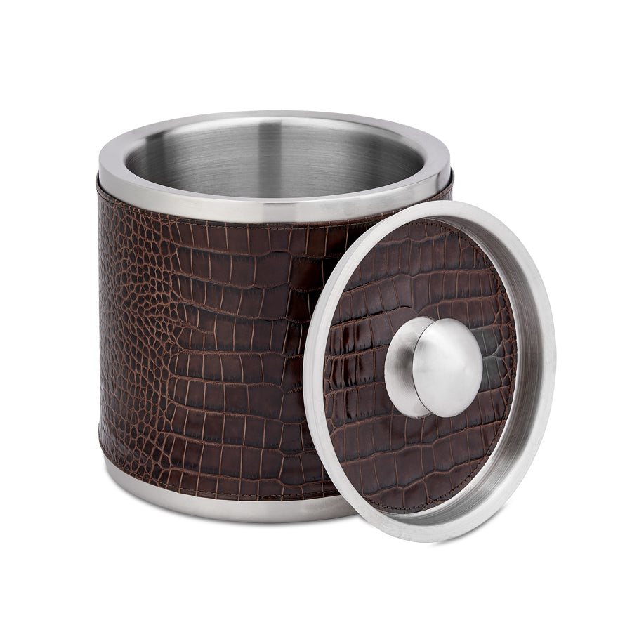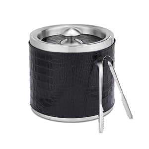Italian Embossed Crocodile leather. Handcrafted stainless- steel ice bucket with ice tongs. Leather wrapped. Holds three quarts.