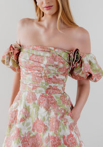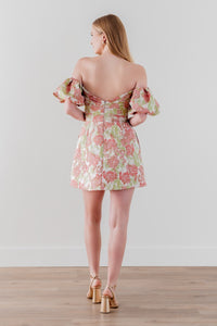 The magic in By Watters—a family-run business of designers, seamstresses, and pattern makers—is understanding how the wants and needs of brides evolve. Embracing drama, versatility, and individuality, By Watters makes dresses for the brides and bridesmaids you want to be. This made-to-order mini comes, quite literally, with a twist: brocade taffeta drapes across to create a stunning shape. Subtle statement-making rosettes sit where the bodice meets the off-the-shoulder puff sleeves, giving it an extra festive look and feel.