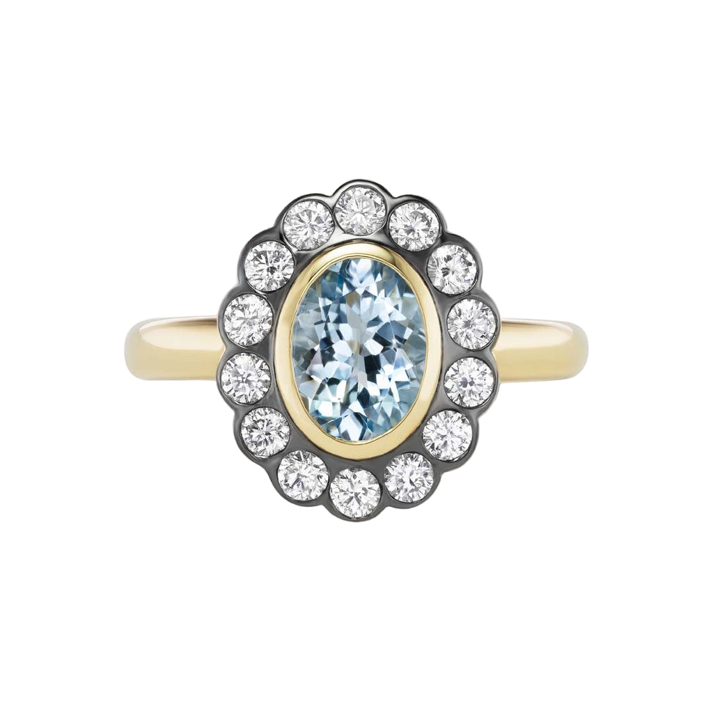 The Lexie N/S Aquamarine Ring showcases a striking north–south–set aquamarine framed by a constellation of white diamonds. A refined reinterpretation of the classic Alexandra Ring, this scaled-down silhouette brings an elevated glow to an everyday stack while maintaining its sculptural presence.
