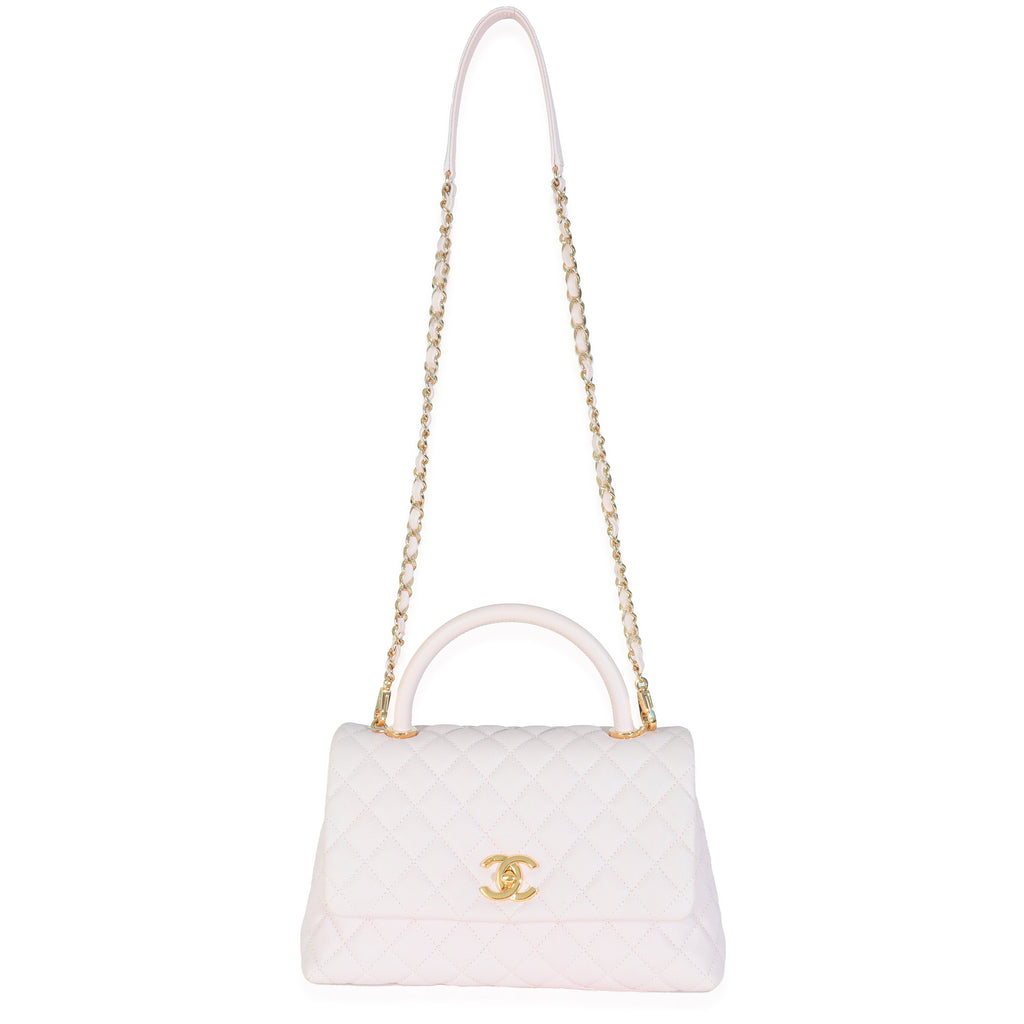 Pre-owned Chanel Medium Coco Top Handle Handbag in light purple quilted caviar leather with gold-tone hardware, circa 2020. Minor signs of wear. Minor corner scuffing. Faint scratching along hardware. Marks and wear along interior. Features flap front with interlocking CC turn-lock closure, top handle, and leather-entwined chain strap. Includes authenticity card and removable strap. Made in Italy.