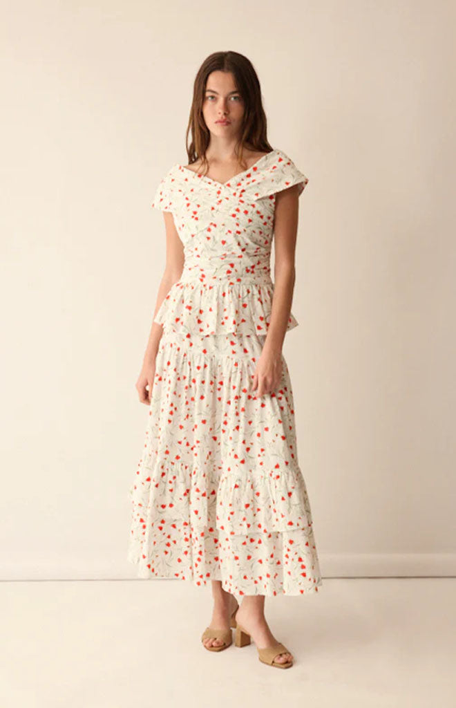Loulou, founder of Loulou La Dune, extends her refined feminine touch from interior design and tableware into the realm of ready-to-wear fashion. Recognizing the desire for beautifully crafted, effortless, and chic clothing, she has created a capsule collection that integrates elegance and ease into everyday wear. A sweet, summery staple defines the Lily Top in Red. Its peplum silhouette beautifully cinches at the waist, creating a flattering shape for all body types. The pleated bodice adds a touch of sophistication, while the stunning deep V-neck décolleté offers a hint of allure. The lightweight cotton fabric ensures breathability and comfort, making it ideal for warm, sunny days. Style it with its matching skirt for a harmonious, garden-inspired look.