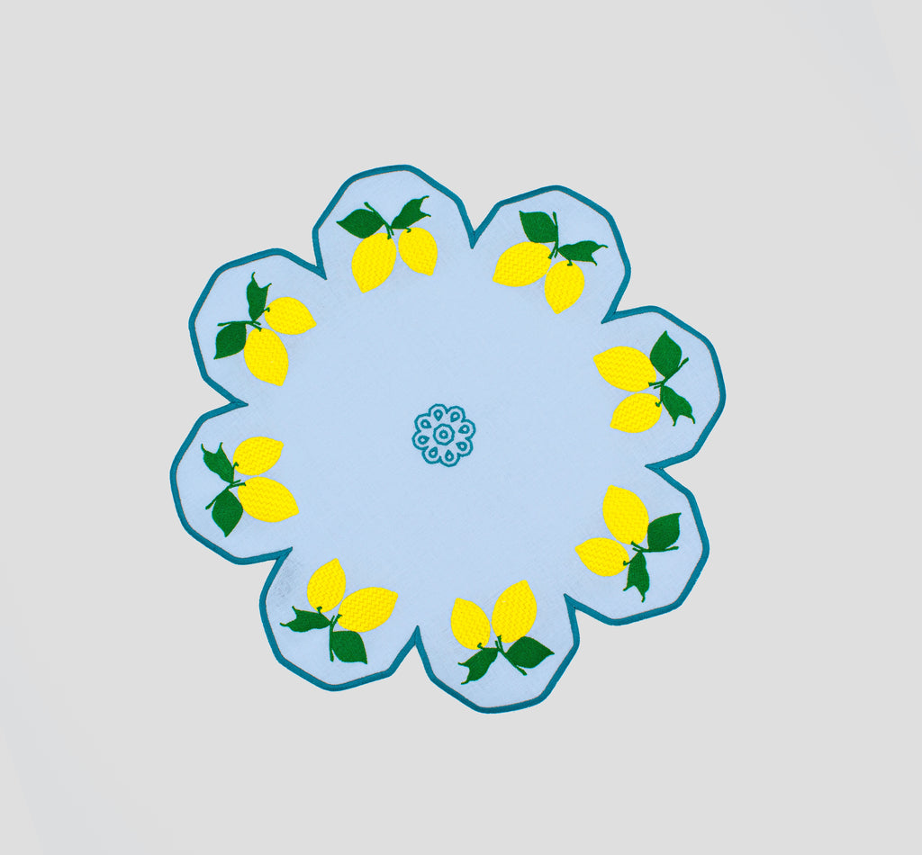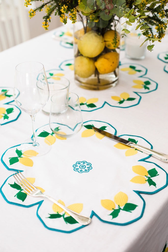 Cibelle embroiders the olive trees, vineyards, lemons, patterns and gardens of Puglia’s countryside to tell the stories of its landscapes and people through their table linens. Using 100% Italian linen and gorgeous embroideries, hand-crafted at every step, each Cibelle piece speaks to its founder Raffaella Gemiti’s mission to combine the craft, culture, and natural beauty of her homeland in unsurpassed table settings. Evoking the fresh lemon trees that dot the Italian countryside, a symbol of Mediterranean style, the Limoni Placemat is an elegant, colorful addition to any tabletop, and can be combined with the Limoni napkins for a matching set.