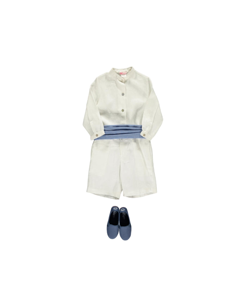 The Linen Cummerbund in Blue adds a refined, traditional touch to any boy’s special occasion ensemble. Expertly tailored from soft linen, it features delicate pleats and covered button fastening on one side for a polished finish. Designed to sit neatly at the waist, this bespoke piece completes any formal look with timeless elegance.