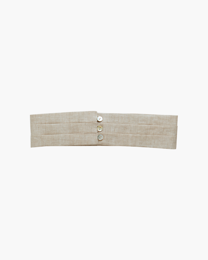 The Linen Cummerbund in Natural lends a refined, traditional finish to any boy’s formal ensemble. Expertly crafted from lightweight linen, it features delicate pleats and a covered button fastening on one side for a polished look. Designed to sit neatly at the waist, this bespoke piece completes special occasion outfits with understated elegance.