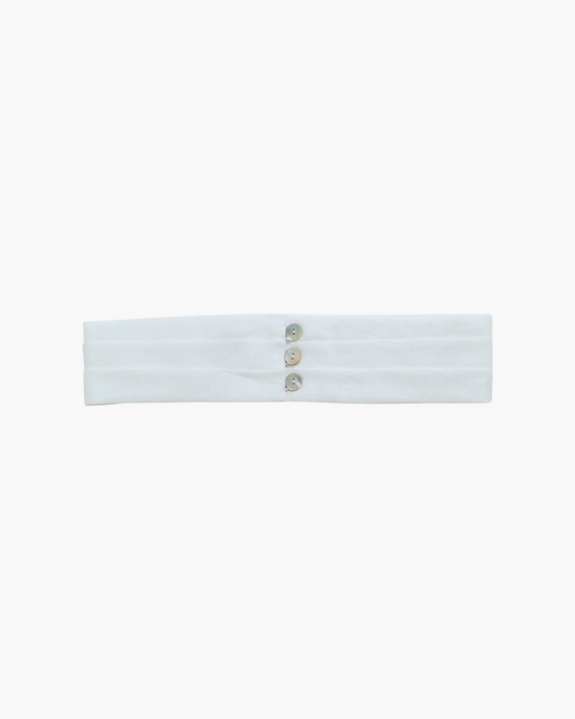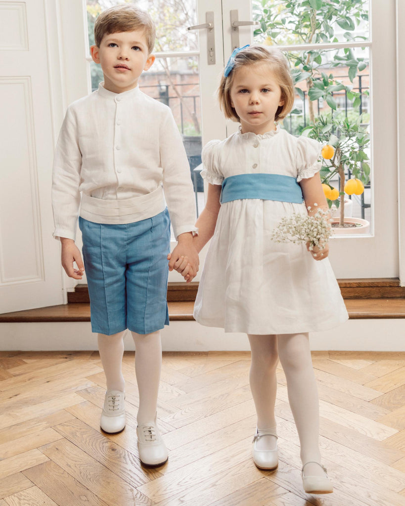 The Linen Cummerbund in Off White adds a refined, traditional touch to any boy’s special occasion ensemble. Expertly tailored from soft linen, it features delicate pleats and covered button fastening on one side for a polished finish. Designed to sit neatly at the waist, this bespoke piece completes any formal look with timeless elegance.