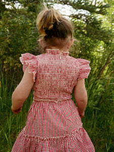 Tomboy looks, girly-girl styles, and an always fashionable approach define EDDY’s aesthetic. With a focus on bold and feminine silhouettes, EDDY dresses and tops pair elevated California bohemian with global inspiration; these are clothes designed to make you feel good inside and out. The Little Lady Field Dress in Red Gingham is made for big opinions and even bigger imaginations. Cut from cheerful red and cream gingham cotton, it’s finished with hand-crocheted floral appliqués and a smocked bodice that moves with her every twirl. With practical pockets, a back zipper, and just-right length, this one’s stitched with whimsy and freedom in mind.