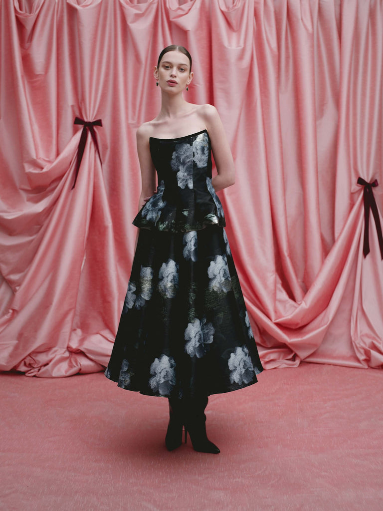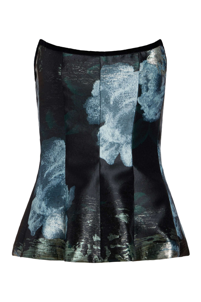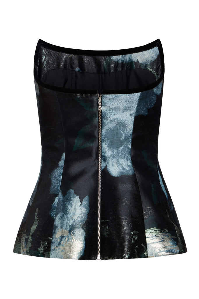 86% polyester, 14% metalized polyester. Lining: 100% silk. Exposed zip along back. Boned to the waist. Fully lined. Made in the USA.