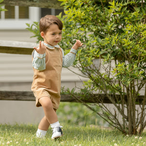 A celebration of the spirit of boyhood, the updated classics from Henry Duvall are curious, imaginative, and sweet. Full of character and playful details, these are easy to care for clothes that kids will love. The Long Sleeve Henry Peter Pan in Charleston Check features soft sage green gingham that is the perfect autumnal shade, and paired with our Oliver Overalls in Clubhouse Camel Corduroy, it is the ideal toddler outfit for everything from family photoshoots to apple picking to Thanksgiving festivities. Pair with our Charleston Check, Clubhouse Corduroy and Fairfax Floral items for the perfect layered sibling look.