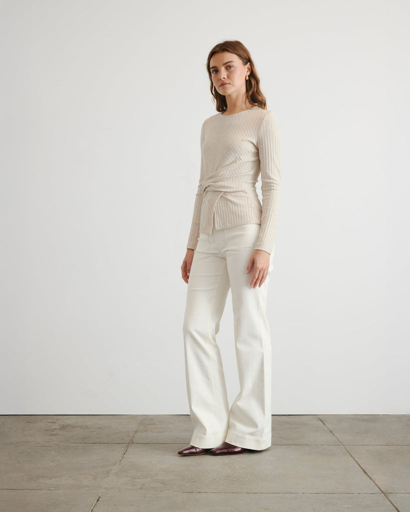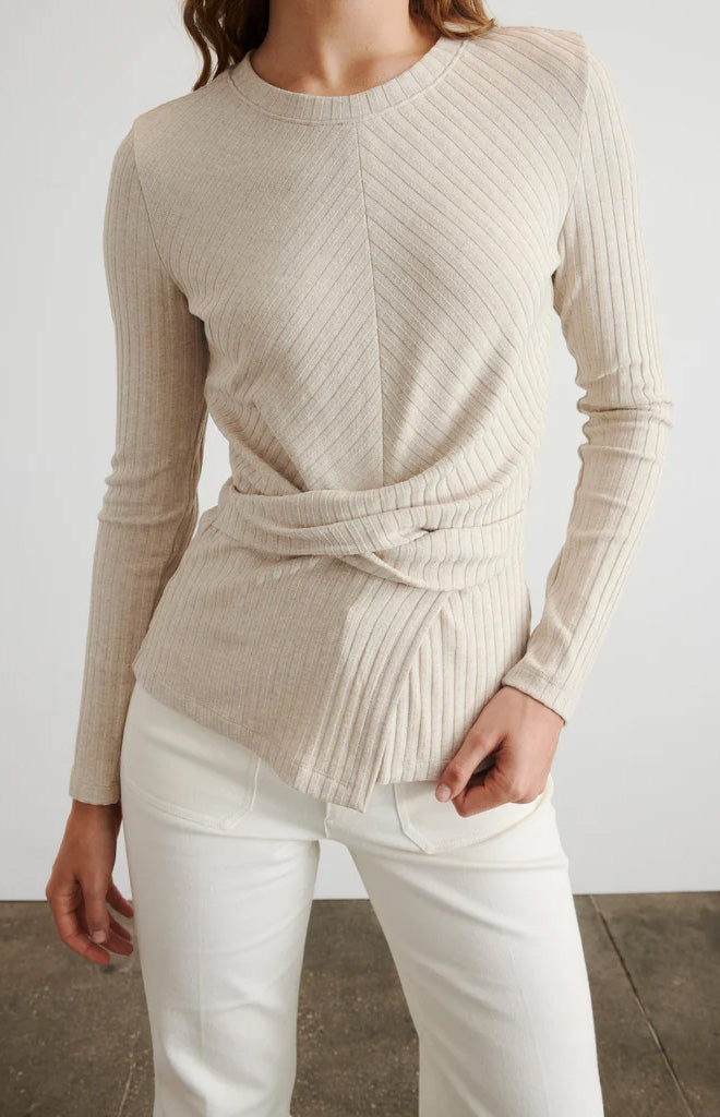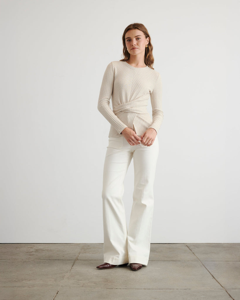 Creating clothing that inspires confidence, celebration, and community, Tanya Taylor is a New York-based womenswear brand whose mission is to provide practicality and style to a range of ready-to-wear in inclusive sizes. Each collection is thoughtfully designed through the artful use of color, texture, and original hand-painted prints. The Long Sleeve Kelsey Top in Oatmeal is a seasonal refresh of a best-selling essential. Designed with a crew neckline, long sleeves, and a twist detail at the waist, this soft knit separate brings ease and polish to everyday outfitting with a nod to the signature Mac Dress twist.