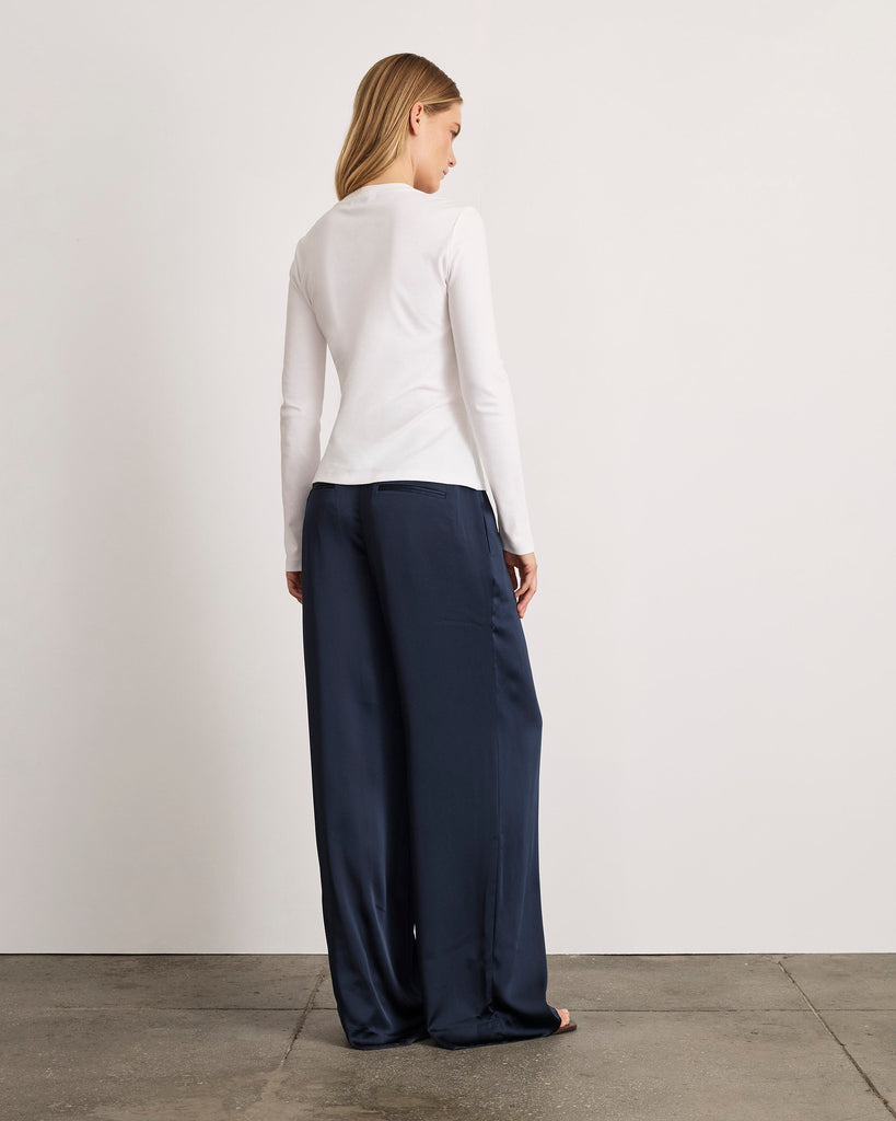 Soft stretch jersey. Crew neckline. Long sleeves. Twist detail at waist. Pull-over style. Unlined.