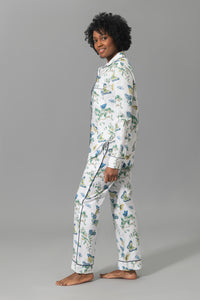 For nearly 100 years and three generations, Matouk has handcrafted luxury linens from the world’s finest materials. Their dedicated artisans in Fall River, Massachusetts are committed to creating the highest quality, most-loved bed, bath, and table linens for your home. Crafted from dreamy cotton percale in a range of vibrant Schumacher prints, the Luca Pajama Set in Baudin Butterfly Blue combines the luxury of Matouk sheeting with the comfort of your favorite lived-in dress shirt. The top features natural corozo buttons, piped details, and a scooped hem. The drawstring trousers have elastic in the back for extra comfort and a flattering fit. Beautifully tailored, these pajamas are just as chic outside the house as they are in the bedroom. Each set arrives in a Matouk gift box.