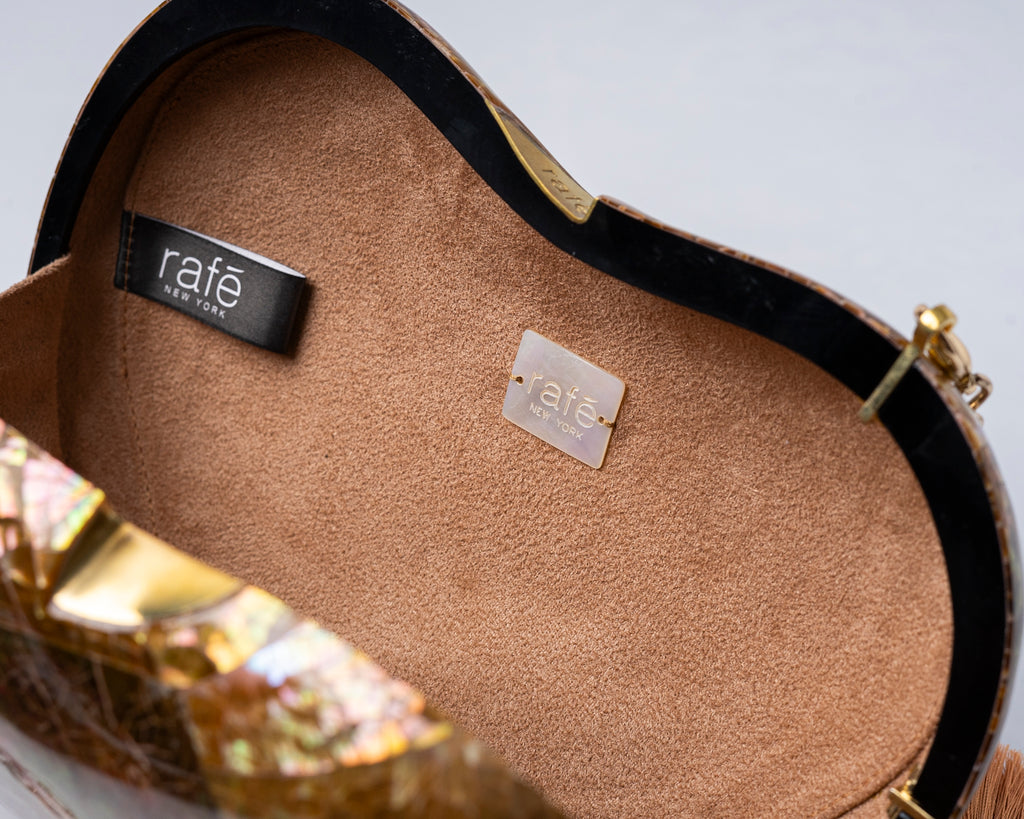 Bean-shaped minaudière crafted in brown lip shell. Tonal tassel accent. Gold drop-in chain. Magnetic closure.
