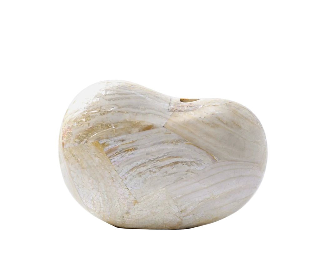 The Lucia Clutch in White is a sculptural minaudière with a softly contoured, bean-inspired silhouette. Crafted in luminous white kabibe shell, the design is accented with a tonal tassel and warm gold hardware, offering subtle movement and refined contrast.
