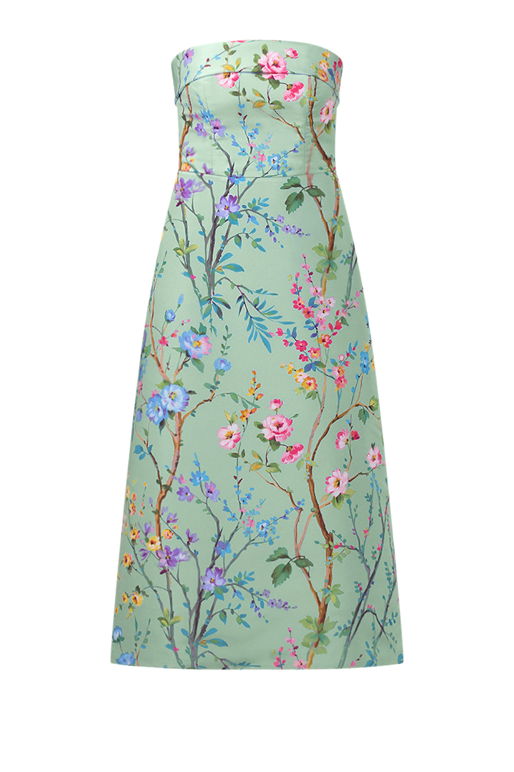 The Lucie Garden Reverie Silk Faille A-Line Midi Dress in White Floral from the Alexia María and Scalamandré for Over The Moon collection is a fresh expression of classic femininity. Crafted in one-of-a-kind silk faille fabric with Scalamandré’s hand-painted Garden Reverie floral print, the strapless silhouette features a sculpted flap for dimension and a full A-line skirt that creates an effortlessly refined shape. Handcrafted in Alexia María’s California atelier, this timeless style is made for wedding celebrations, spring events, and elegant summer occasions.