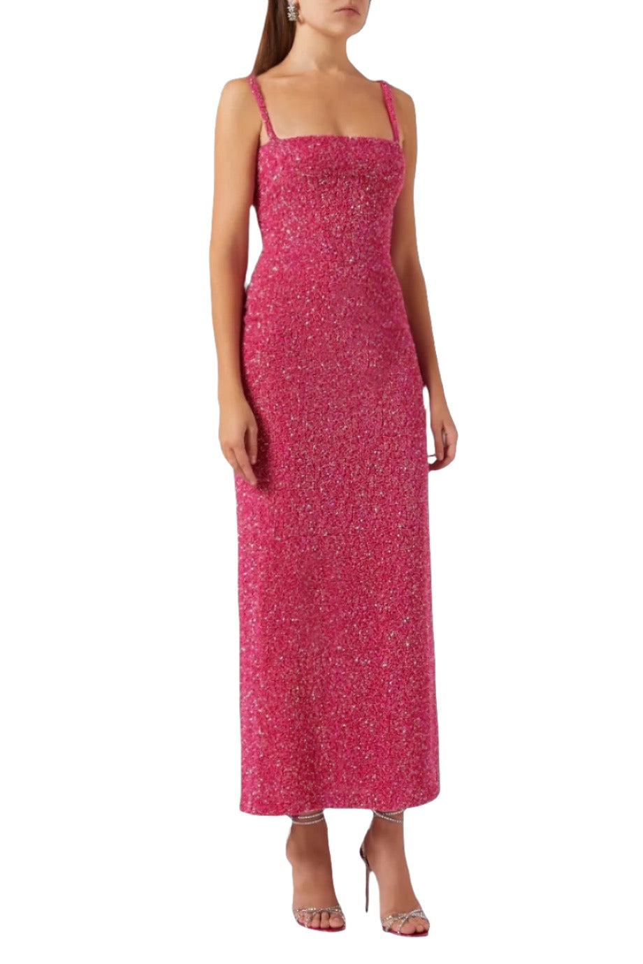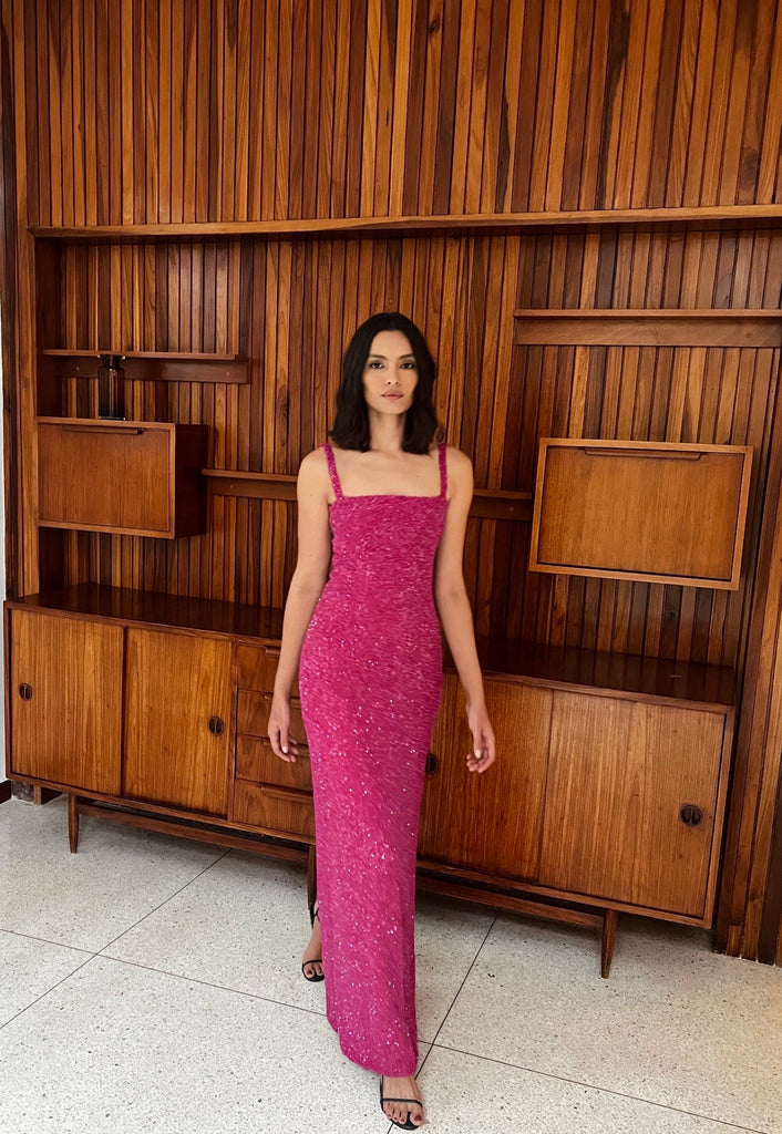 Founded by Daniela Panaro, No Pise La Grama, which translates to “don’t step on the grass,” is a Venezuelan fashion brand known for its feminine, timeless designs. As the name suggests, there’s a strong connection to nature through the elevated yet laid-back aesthetic inspired by travel and the art of traditional craftsmanship. The Luciernaga Dress In Fuchsia channels ’90s-era red carpet style with it's clean and simple silhouette, punctuated with a subtle shimmer throughout.