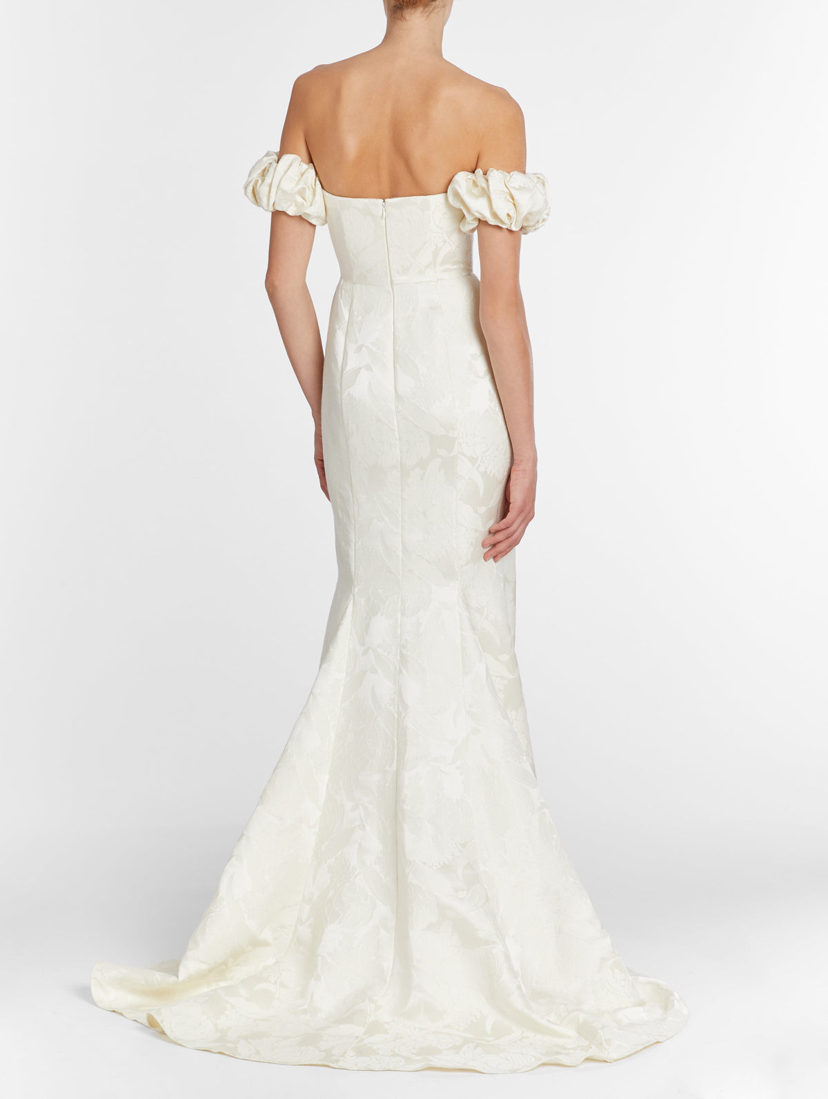 Named after a particularly radiant group of galaxies, Markarian combines designer Alexandra O’Neill’s love of the cosmos and celestial romanticism with timeless design and modern silhouettes. A forward-thinking approach to fashion and a focus on fine craftsmanship result in dresses that are beautiful, well-made, and flattering. Here, the Luisa Off-The-Shoulder White Floral Jacquard Gown features a sweetheart off-the-shoulder neckline and regal puff sleeves.