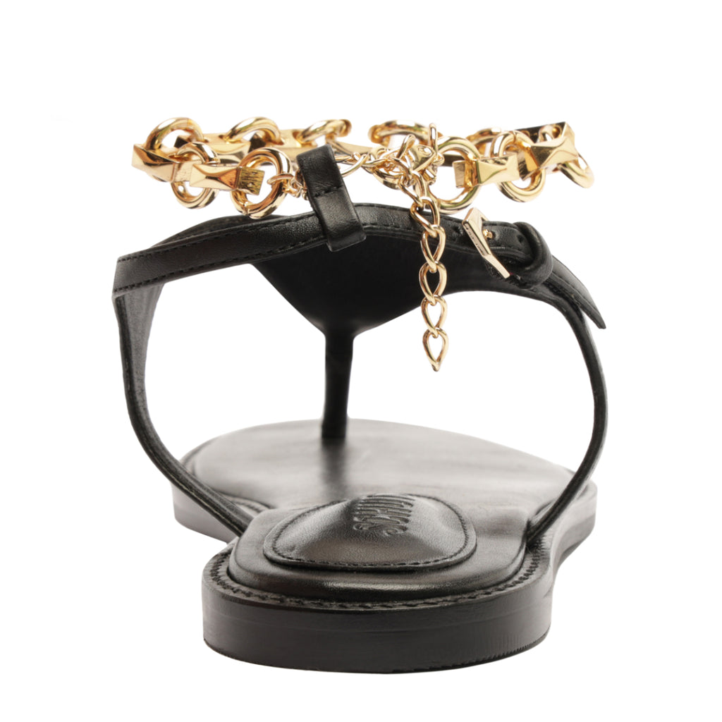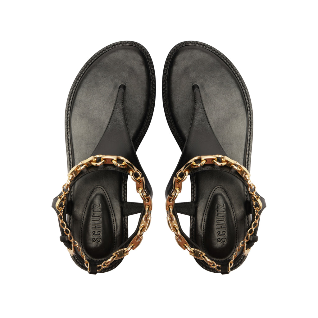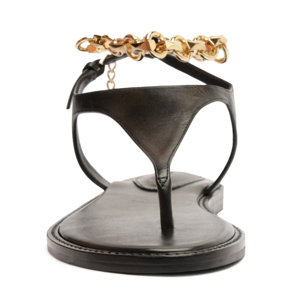Leather upper. Leather lining. Man-made sole. Metallic ankle detail. Thong gladiator silhouette.