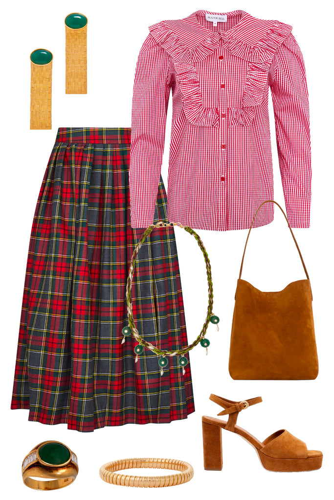 The Mae Top in Carmine Check introduces a fresh silhouette to the Hunter Bell collection. Rendered in classic gingham with a modern twist, it features a collared button-front design with ruffled yokes at the front and back, along with voluminous long sleeves finished with button cuffs. Feminine yet tailored, Mae strikes a playful balance of charm and polish. Pair it with the Kinsley Bubble Skirt for a coordinated set that feels festive, modern, and distinctly Hunter Bell.