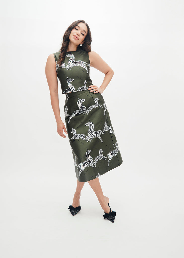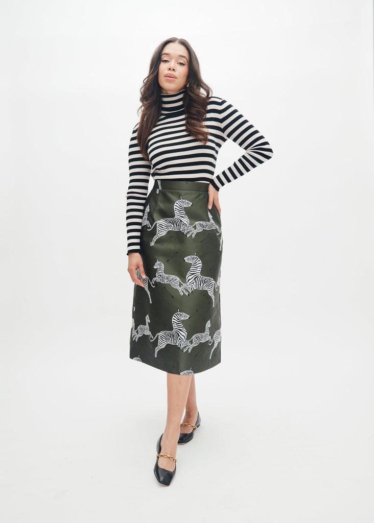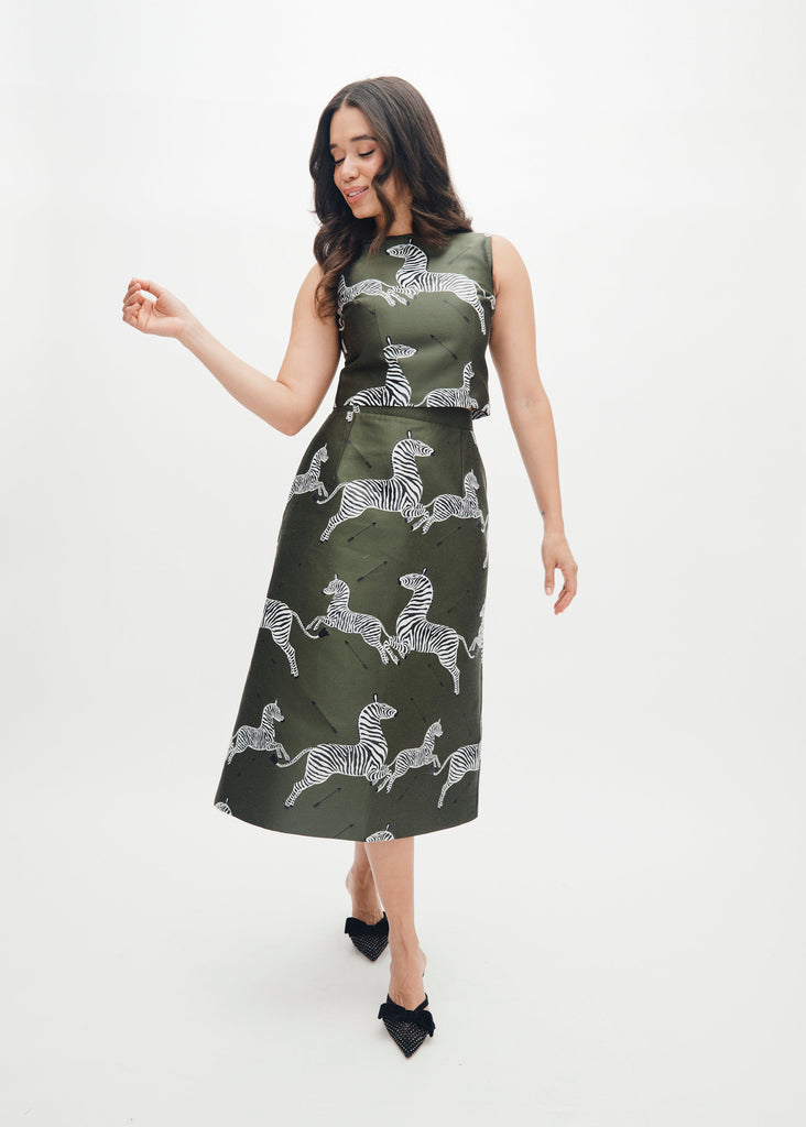 MAE New York seeks to revitalize New York’s historical garment district by creating small-batch and made-to-order collections—modern interpretations of 1960s glamor—highlighting tailoring, luxury materials, and craftsmanship. A modern classic with a wild streak, the Hallie Skirt in Olive Zebra Jacquard features a clean A-line silhouette, soft shaping darts, and an easy, flattering fit designed to sit comfortably at the waist and move effortlessly from day to night. Crafted in collaboration with Scalamandré, Hallie is cut from a groundbreaking new textile: for the first time in its history, Scalamandré has reimagined its iconic Zebras motif as a jacquard. Previously available only as printed fabric and wallpaper, the zebras now come to life as a show-stopping tapestry, woven exclusively in Italy. Each zebra is intricately woven into the warp and finished with tonal black lurex, creating a subtle, luxurious sheen that catches the light.