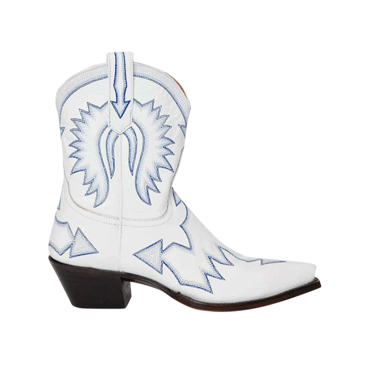 Founded by sisters Lizzie Means Duplantis and Sarah Means, Miron Crosby is inspired by the sisters’ experiences of growing up on their family’s West Texas cattle ranch, and later living and working in New York City. The artisanal boots are designed in New York, handmade in Texas, and created with love for every bride. Dress her up or down, the Maggie White is the epitome of traditional western meets fashion. Elevated in classic cool white with ombré blue stitch, Maggie isn’t just a cowboy boot; she’s your go-to for every occasion. Handmade in Texas and crafted of the finest materials, these cowboy boots are a statement of quality, artistry, and style. Make them your own by customizing them with your monogram on the exterior shaft uppers and your wedding date on the ear pulls. Available exclusively for custom order, please allow 6-8 months for production.