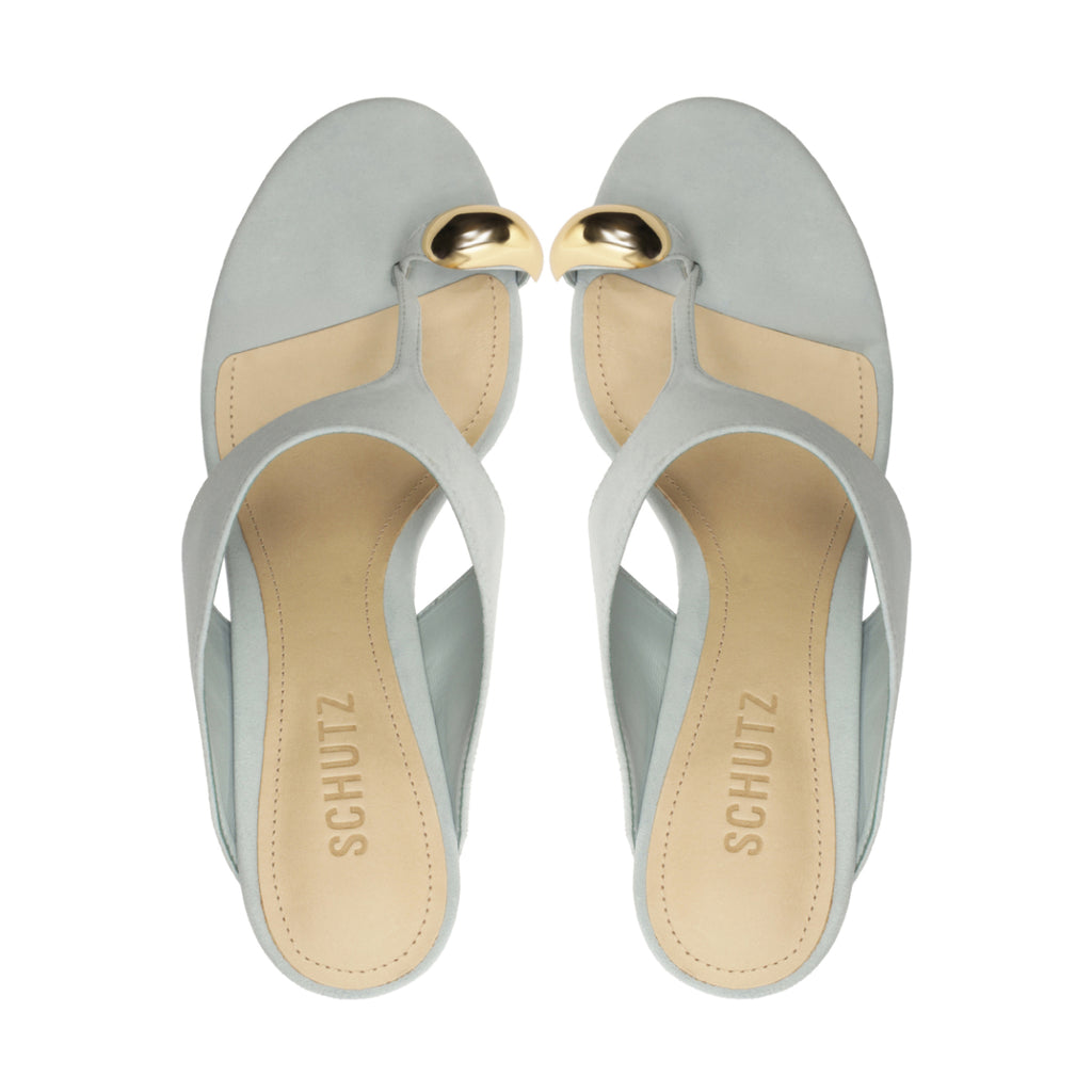 The Maisie Nubuck Sandal in Light Azure brings a modern, minimal sensibility to warm-weather dressing. Designed with a sleek mid stiletto heel, a clean thong entry, and a wide upper strap, it offers a polished silhouette with effortless ease. A subtle gold toe accent adds a refined touch of shine—ideal for elevating evening looks or giving everyday outfits a hint of sophistication.