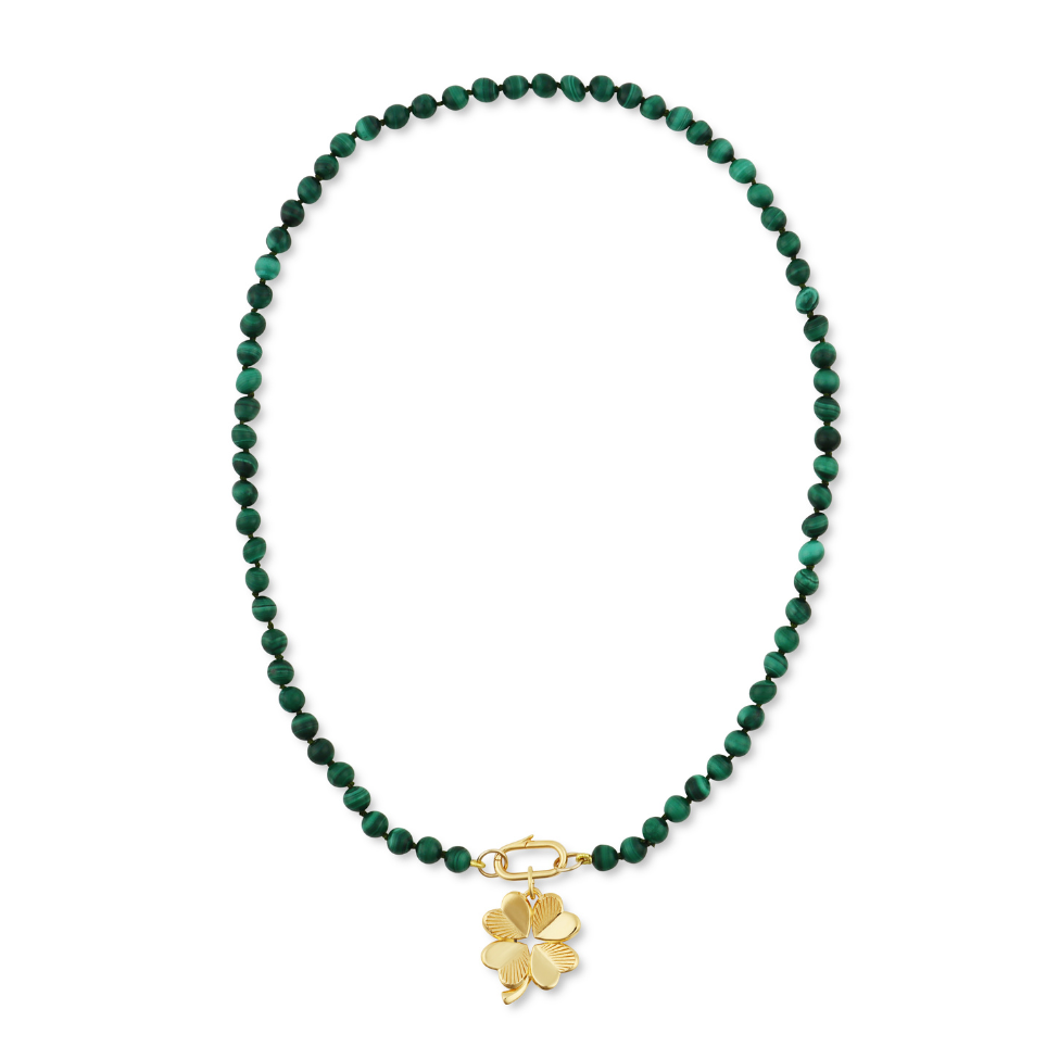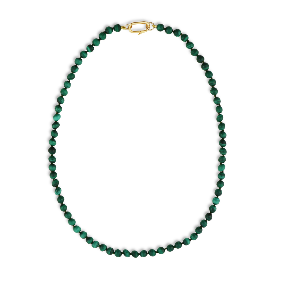 0.16" round, gumball-smooth malachite beads. Hand-knotted silk cord between each bead. Tarnish-resistant 18K gold-filled findings that are long-lasting with proper care. Clip measures ~0.20" tall, ~0.53" wide. These are natural stones, so slight variation in color may occur between strands.