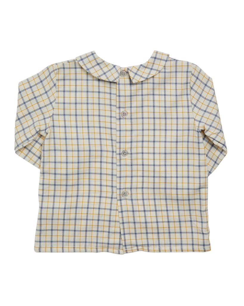 Blue and yellow check cotton fabric. Peter Pan collar. Back fastening with mother-of-pearl buttons. Long sleeves with button cuffs. Made in Spain.