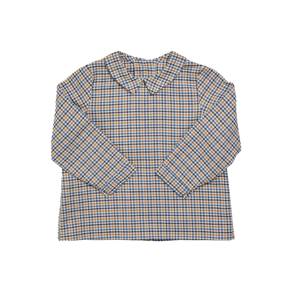 Camel and blue check cotton fabric. Peter Pan collar. Back fastening with mother-of-pearl buttons. Long sleeves with button cuffs. Made in Spain.