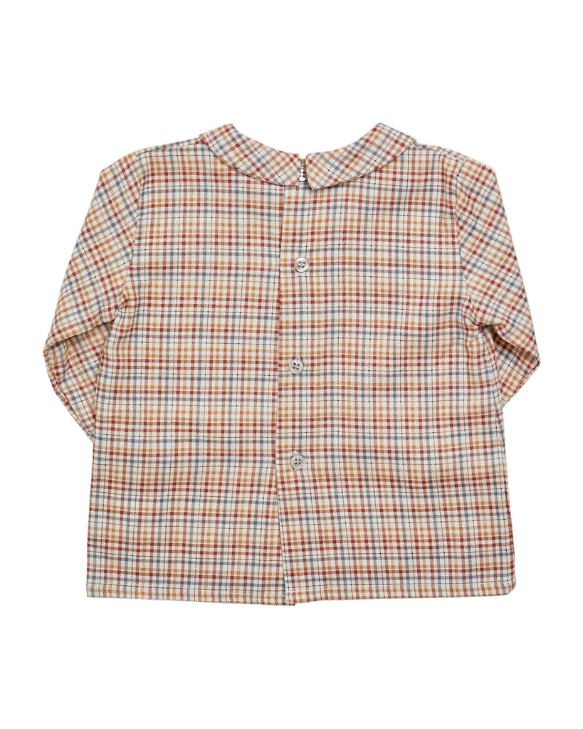 Mini check cotton fabric. Peter Pan collar. Back fastening with mother-of-pearl buttons. Long sleeves with button cuffs. Made in Spain.