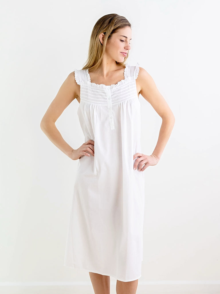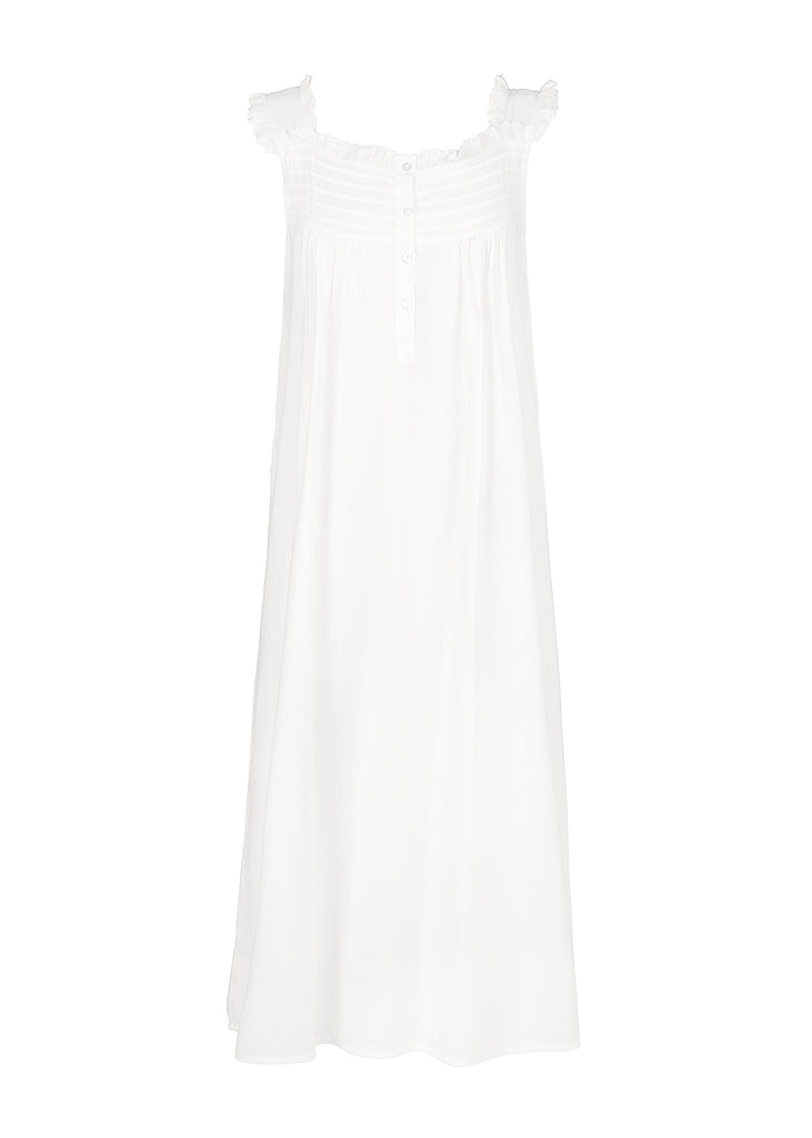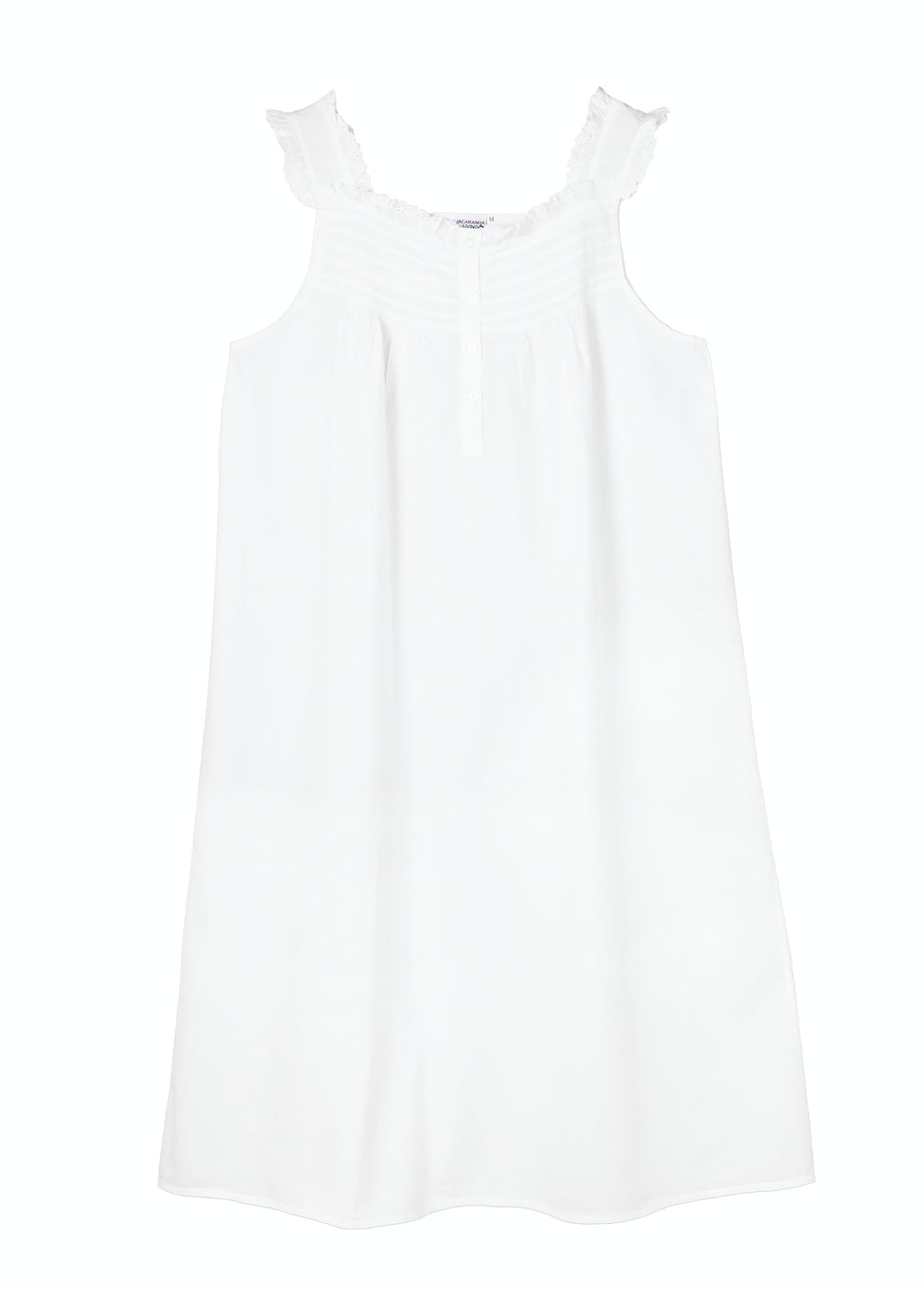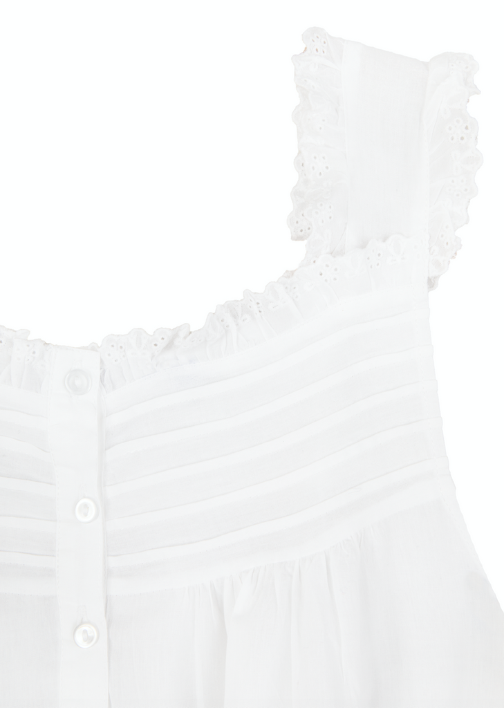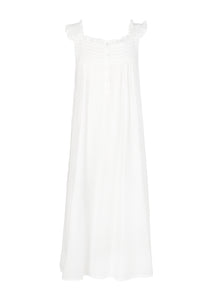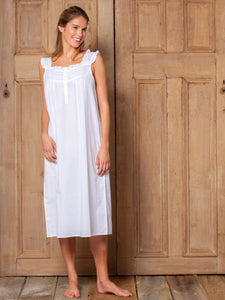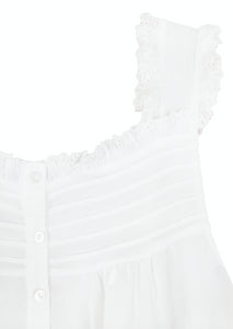 Embracing a European aesthetic of hand embroidery with elegant touches of cotton lace, Jacaranda Living produces a wide variety of high quality luxury linens—for bath, table, sleepwear, and more that feel as good as they look in your home or wardrobe. Crafted in white cotton, with a square neckline, buttons down the front, and a strap sleeve, the the Mandi White Cotton Nightgown is an ideal accomplice for a good night's sleep, or just lounging at home. This nightgown can be monogrammed on the front left hem position.