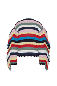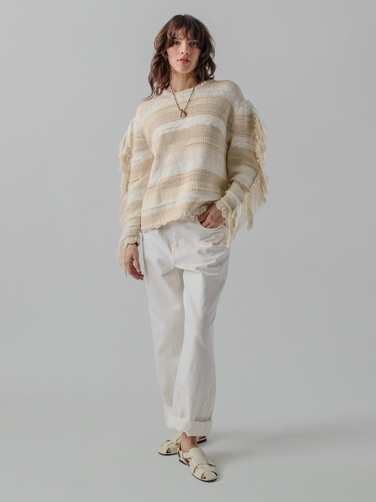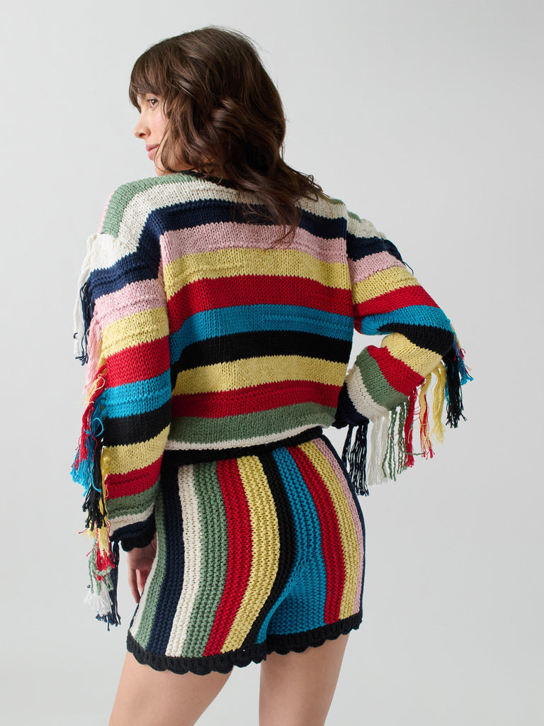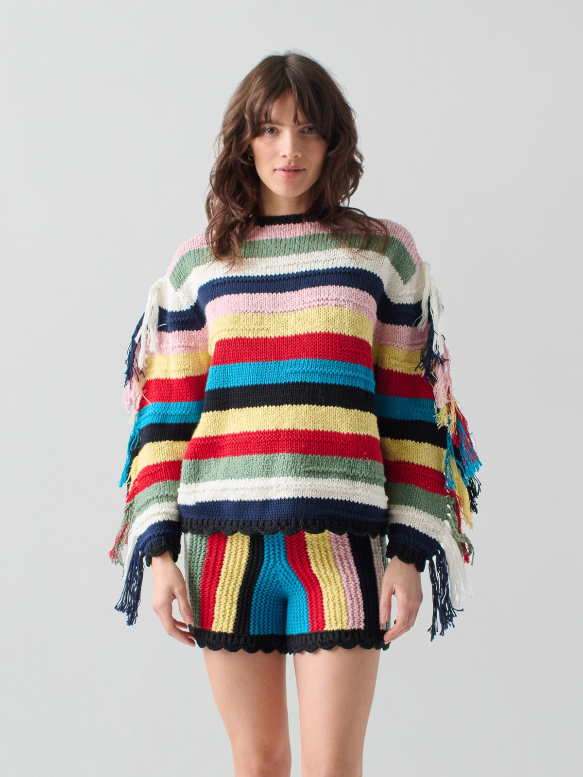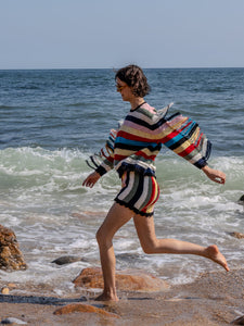 Lingua Franca is a line of sustainably-sourced, fair trade luxury ready-to-wear and cashmere pieces, all hand-stitched by women in New York City. Every word on Lingua Franca’s staple pullover sweaters is chalked in script by designer Rachelle Hruska MacPherson before it is ever stitched. Marathi Beach, just a short boat ride from Patmos, moves at an even slower pace—an ideal reminder to unwind. The hand-tied fringe Marathi Crewneck in Stripe Multi captures that feeling of slowing down. Made in partnership with women-led, fair trade-certified artisans in Peru, these striped cotton crewneck sweaters are crafted with a chunky gauge and loose tension, creating an airy, open-knit design. Variegated reverse stitches run throughout for added texture and style. Pair with the Marathi Shorts or Marathi Skirt.
