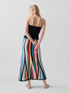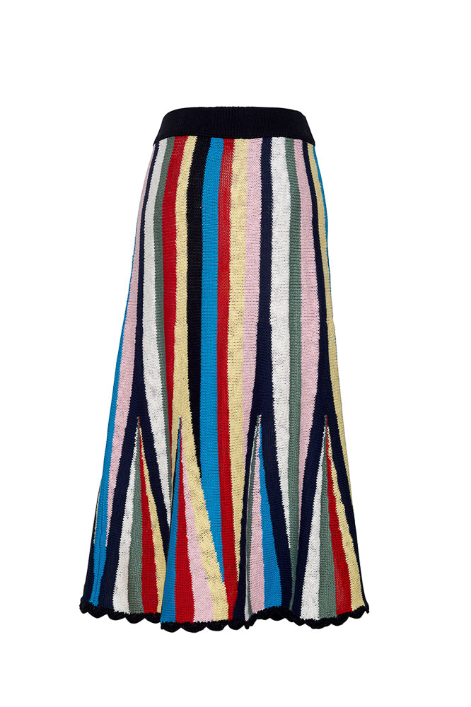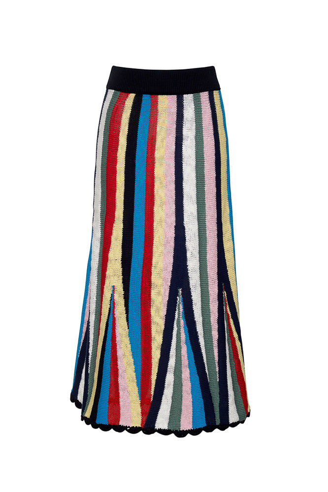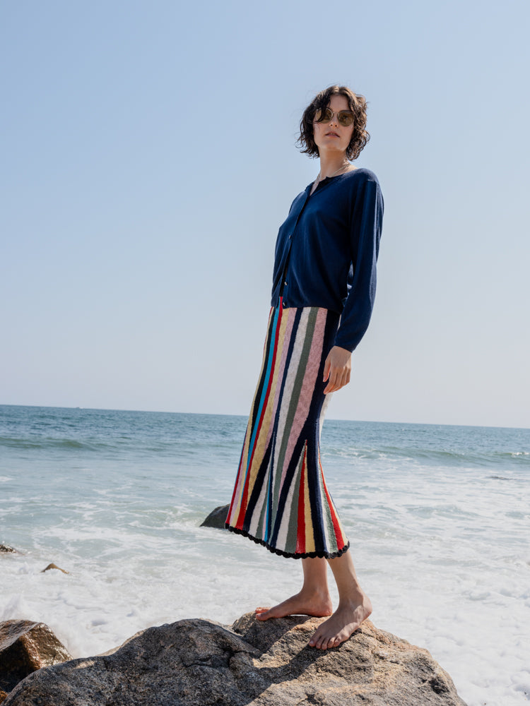 Lingua Franca is a line of sustainably-sourced, fair trade luxury ready-to-wear and cashmere pieces, all hand-stitched by women in New York City. Every word on Lingua Franca’s staple pullover sweaters is chalked in script by designer Rachelle Hruska MacPherson before it is ever stitched. Named after Marathi Beach, just a short boat ride from Patmos, the Marathi Skirt in Stripe Multi capture the peaceful escape and slower pace of the island. Made from striped cotton, these fitted cotton knit shorts in a textured stitch feature and elastic waistband and a hand crocheted hem. Made from women led, fair trade certified, partners in Peru. Pair with the Marathi Crewneck or Marathi Tank.