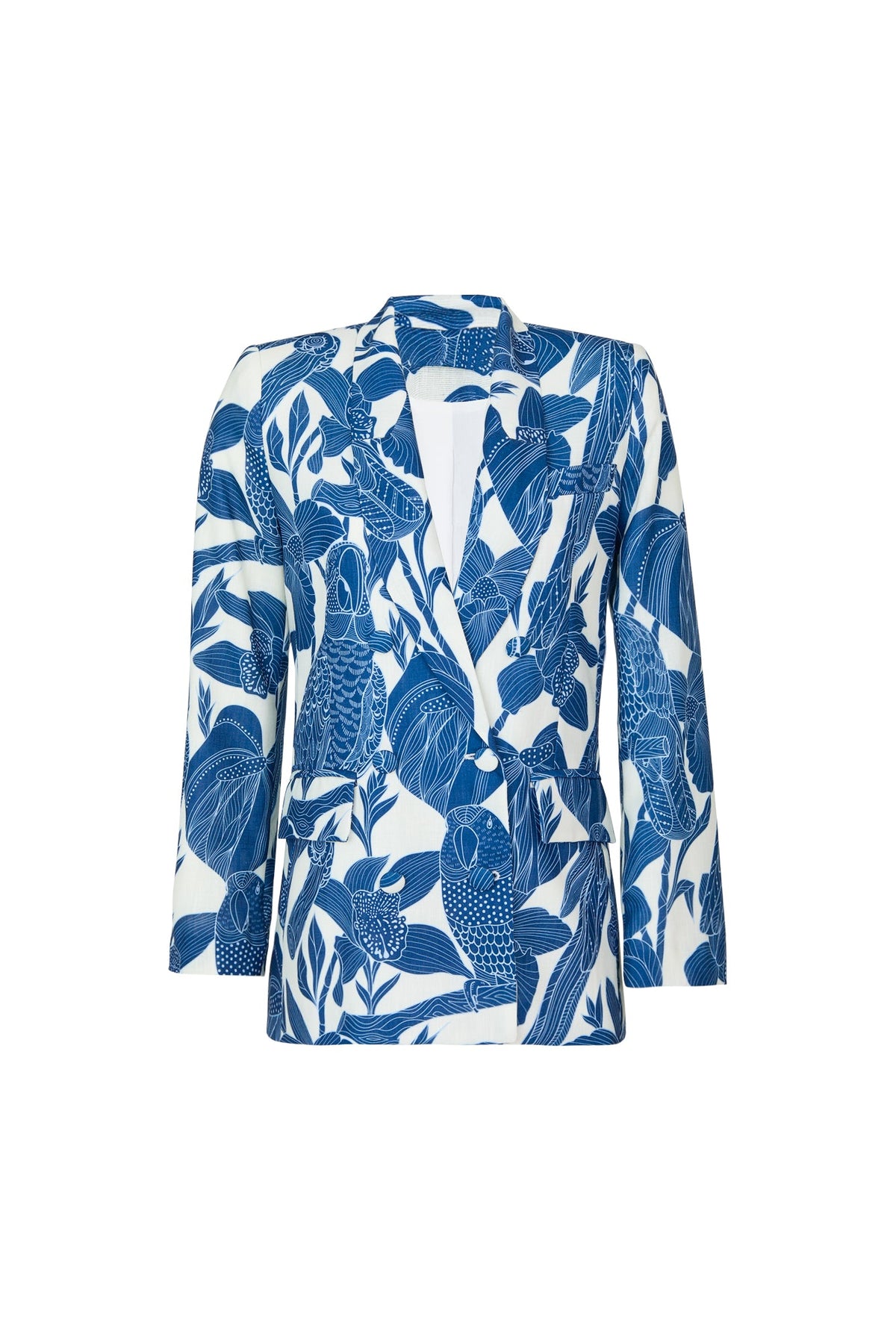 Founded by Daniela Panaro, No Pise La Grama, which translates to “don’t step on the grass,” is a Venezuelan fashion brand known for its feminine, timeless designs. As the name suggests, there’s a strong connection to nature through the elevated yet laid-back aesthetic inspired by travel and the art of traditional craftsmanship. The Marcela Tailored Jacket Suit in Canario Blue Print blends refined structure with vibrant, nature-inspired color. Crafted from 100% linen, this sharply tailored silhouette is elevated by its bold botanical print, striking the balance between polished sophistication and expressive flair.