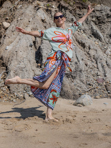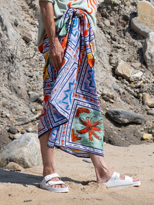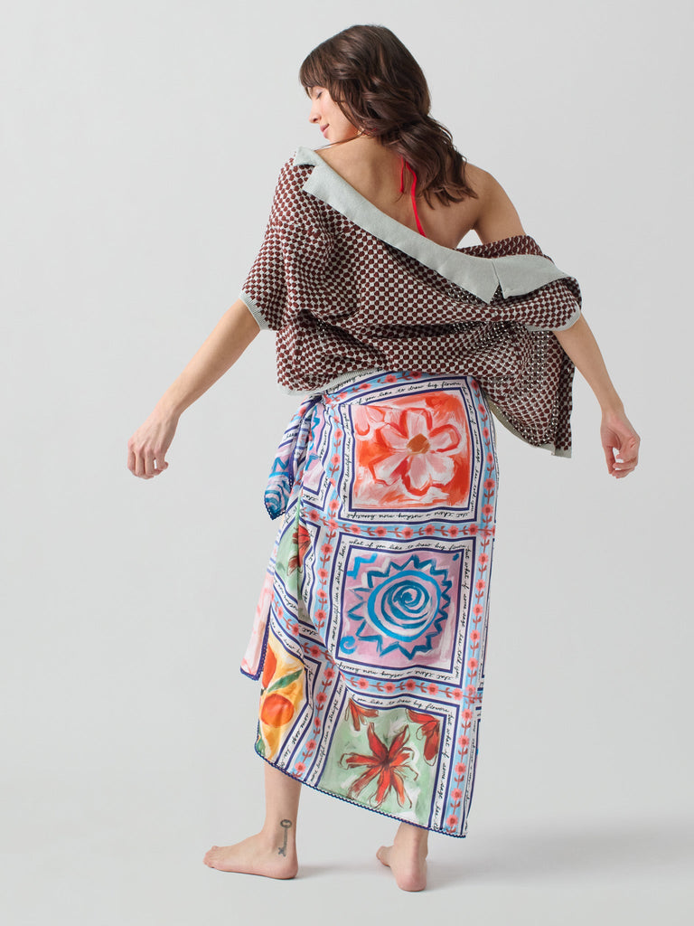 Lingua Franca is a line of sustainably-sourced, fair trade luxury ready-to-wear and cashmere pieces, all hand-stitched by women in New York City. Every word on Lingua Franca’s staple pullover sweaters is chalked in script by designer Rachelle Hruska MacPherson before it is ever stitched. The print on the Marcia Sarong in Ceramic is inspired by hand-painted ceramics from a traditional house in the Chora of Patmos. For this collection, the brand collaborated with the estate of the late Patmos poet Robert Lax, and this special print features his words: “What if you like to draw big flowers, but what if some sage has told you that there is nothing more beautiful, nothing more beautiful than a straight line?” The sarong is also named after Robert’s niece, Marcia, who has been instrumental in making this partnership possible. Pair it with the Reina Hoodie.