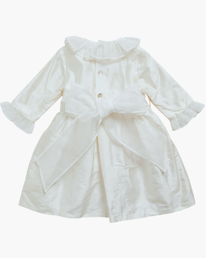 100% Dupioni silk with organza detailing. Ruffle collar and cuffs. Integrated petticoat. Back button fastening with pearlized buttons. Matching ribbon tie. Made in Spain.