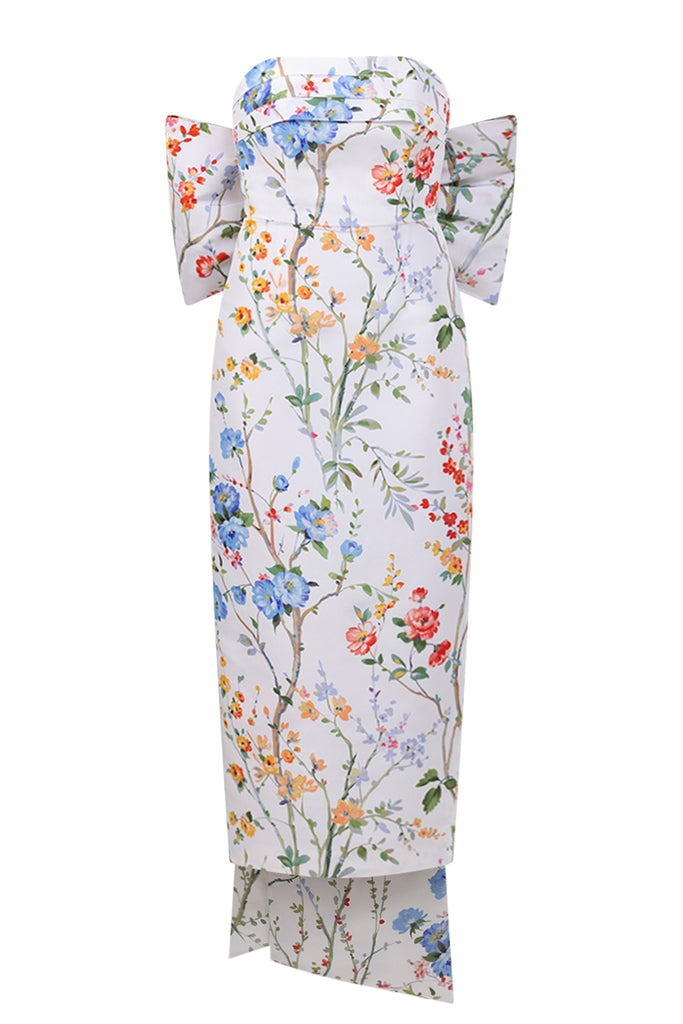 The Margaret Garden Reverie Silk Faille Midi Dress in White Floral from the Alexia María and Scalamandré for Over The Moon collection is a playful yet poised take on feminine dressing. Crafted in one-of-a-kind silk faille fabric with Scalamandré’s hand-painted Garden Reverie floral print, the design features an oversized bow at the back with flowing sash details for a touch of signature Alexia María drama. Handcrafted in Alexia María’s California atelier, this timeless piece is perfect for wedding celebrations, parties, and elegant evening events.