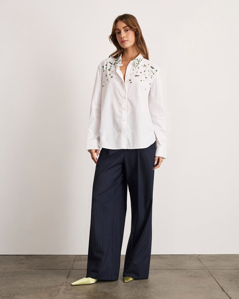 The Margaux Embellished Shirt in Optic White redefines timeless tailoring with a touch of sparkle. Crafted from crisp cotton shirting, this elevated essential features delicate crystal embellishments along the shoulders for subtle shine and dimension. Designed with a straight-cut silhouette inspired by classic men’s shirting, Margaux offers both structure and ease—ideal for pairing with the Adler Pant for a polished day-to-night look.