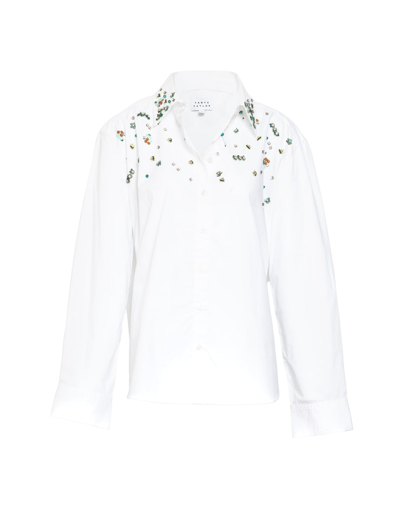 Cotton shirting. Crystal embellishment at shoulders. Collared neckline. Button-front closure. Long sleeves with button cuffs. Straight-cut silhouette. Designed for a relaxed, slightly structured fit.